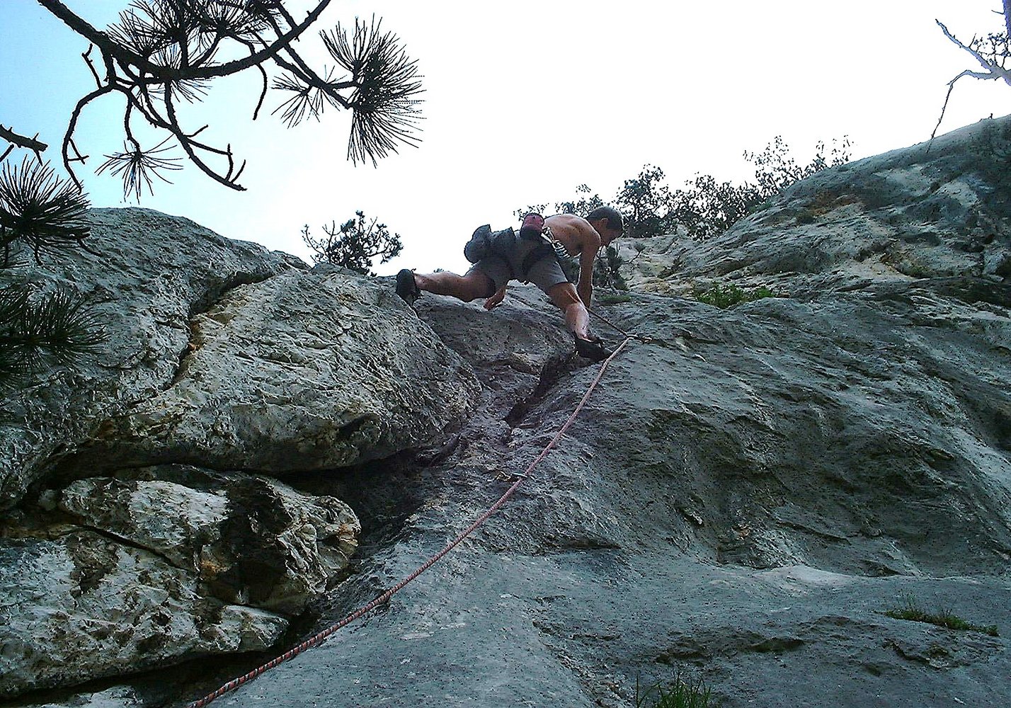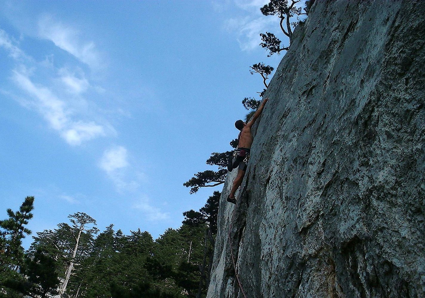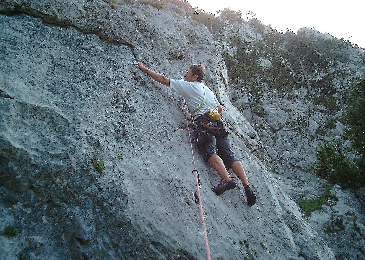 Ganz gute Wandstellen, die gegen oben hin immer besser werden, aber auch Blockgelände ist vorhanden. Die Tour ist gut abgesichert, bei Zuhilfenahme der Haken reduziert sich die Schwierigkeit auf 6+