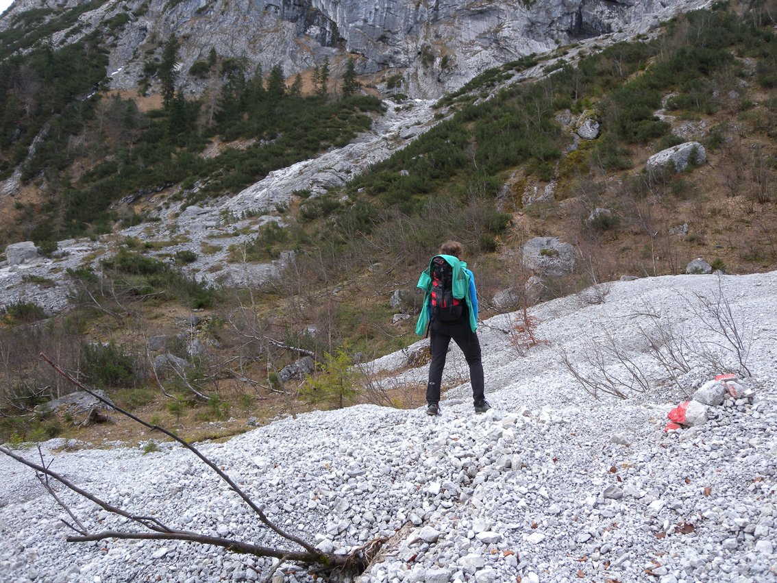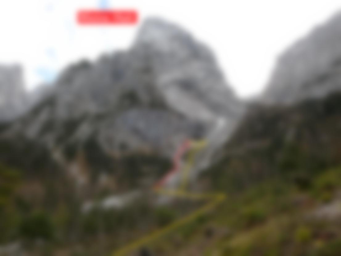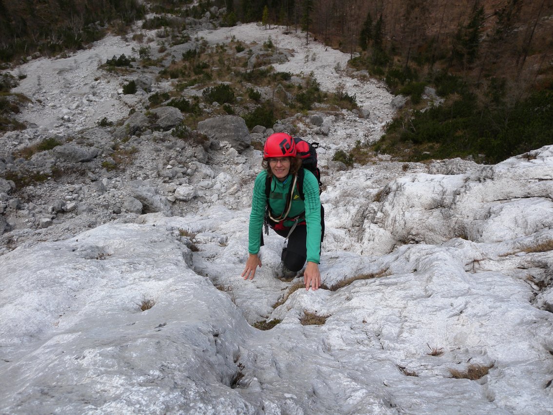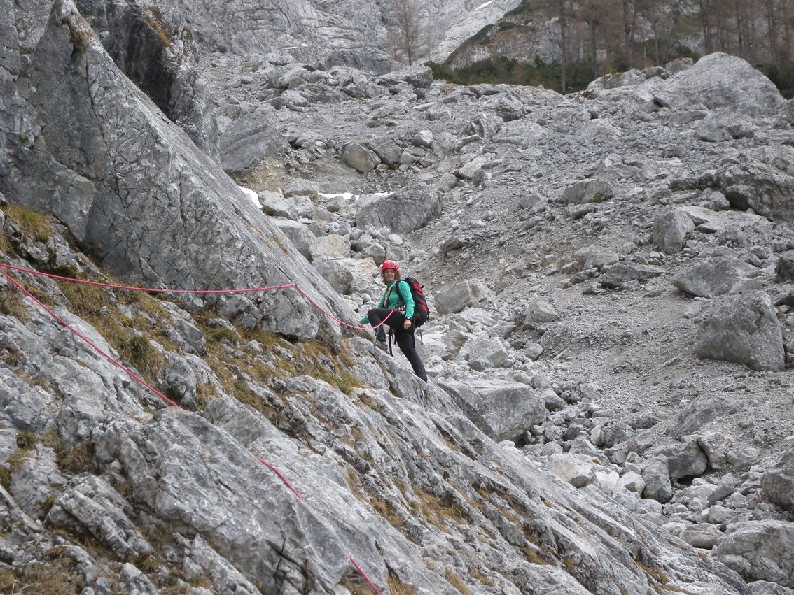 Sehr nett hergerichtete Übungsklettertour in wilder Umgebung am Fuß der mächtigen Nordwestwand der Kleinen Halt. Die Tour verläuft unten in einem Bachbett, oben dann über teilweise plattigen Fels. Für Einsteiger gut machbar, man sollte sich von den ersten glatten Metern nicht abschrecken lassen.