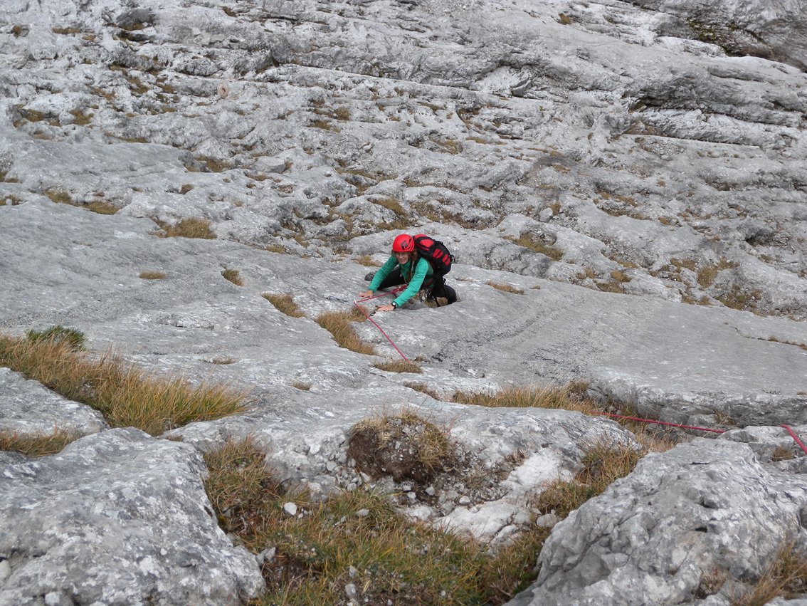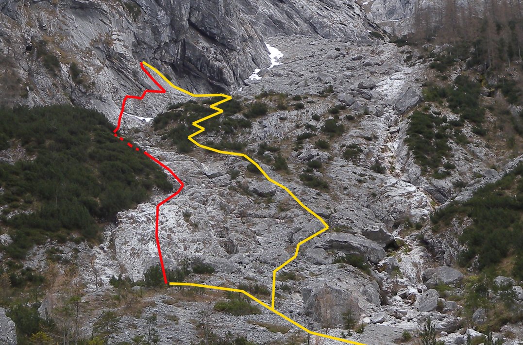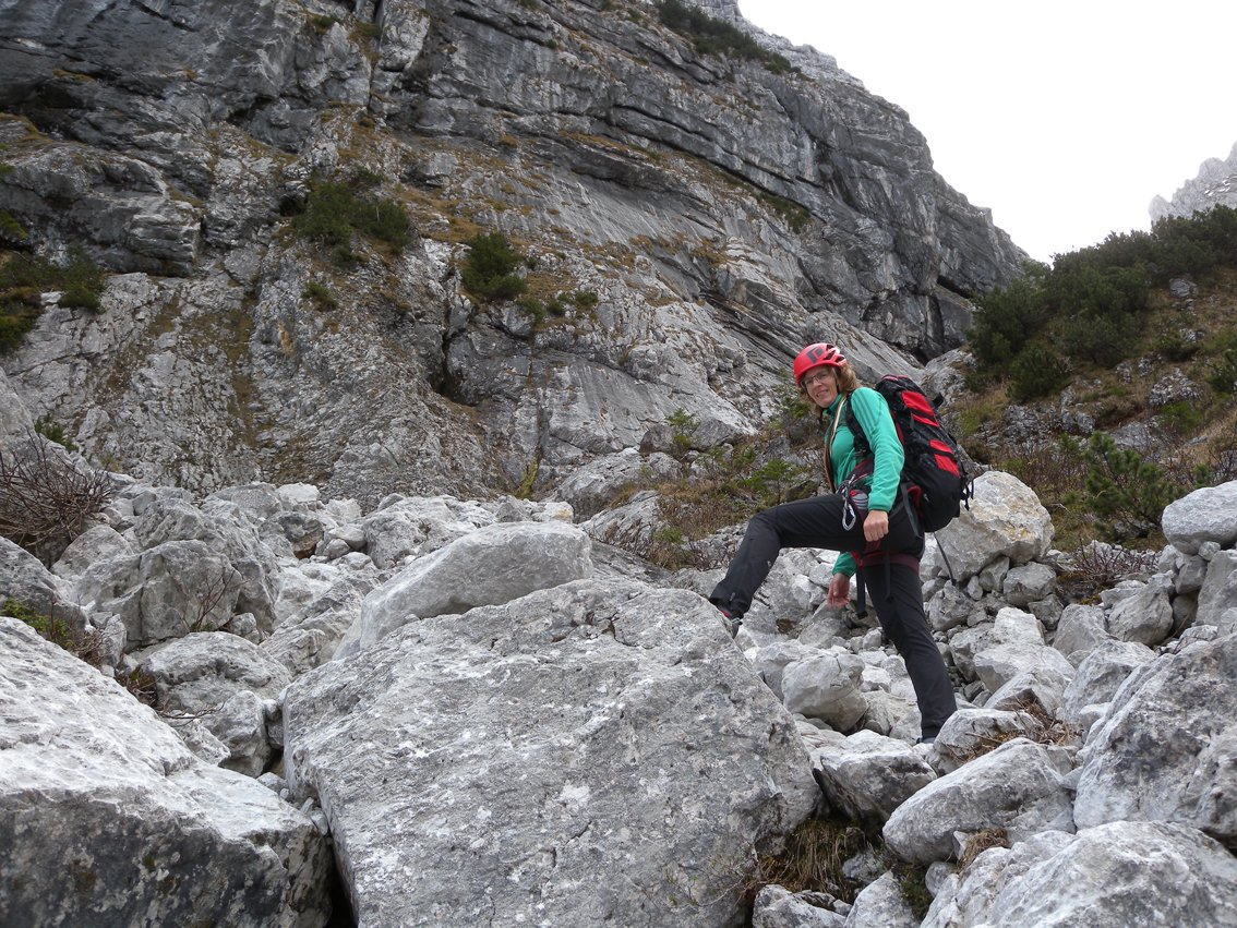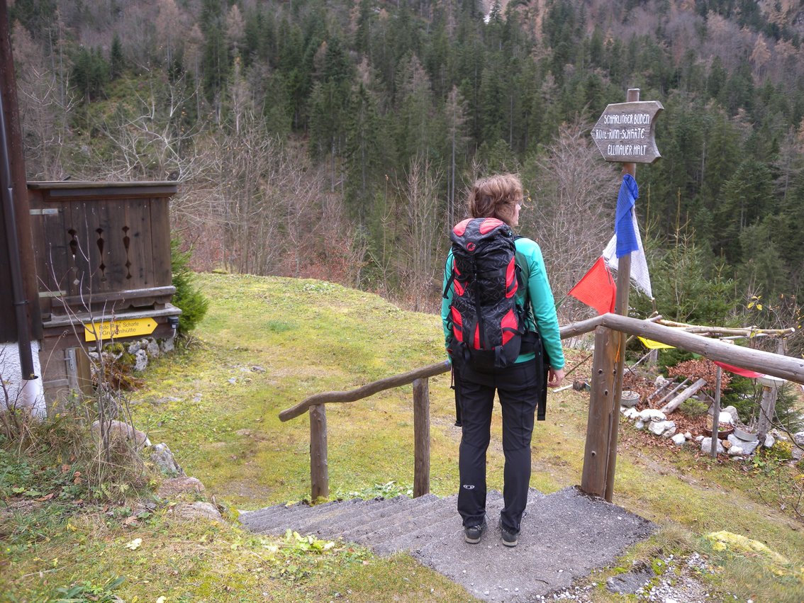 Sehr nett hergerichtete Übungsklettertour in wilder Umgebung am Fuß der mächtigen Nordwestwand der Kleinen Halt. Die Tour verläuft unten in einem Bachbett, oben dann über teilweise plattigen Fels. Für Einsteiger gut machbar, man sollte sich von den ersten glatten Metern nicht abschrecken lassen.