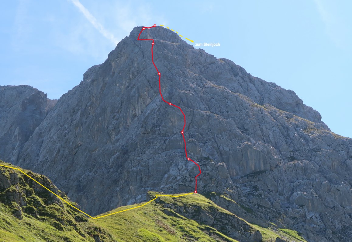 Siehe Topo. Der Einstieg ist am Ende des langen Wiesengrates, welcher schon vom Steinjoch aus sichtbar ist.