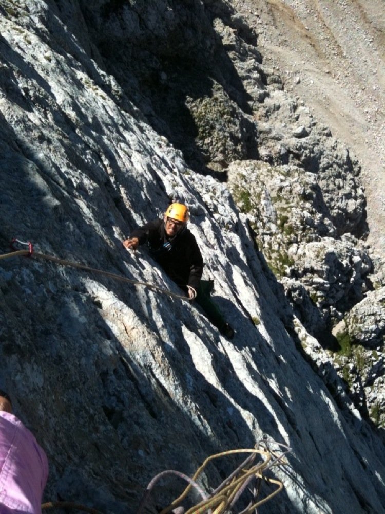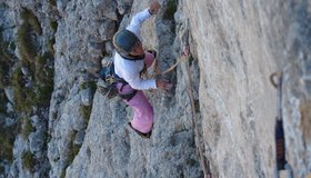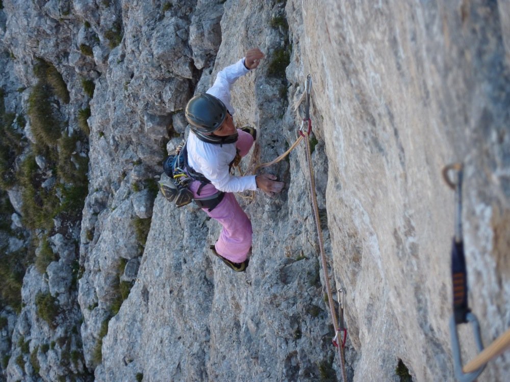 Der Westwand-Gedächtnisweg ist sicher eine der besten Routen am Koschtunikturm. Der direkte Einstieg – also die ersten beiden Längen weisen zwar noch ein paar schrofige Passagen auf, bieten jedoch sehr diffizile Kletterei auf dem wahrscheinlich kompaktesten Stück Fels der Karawanken. Wehe wer sich im Routenlesen schwer tut... Achja, noch kurz was zur Schwierigkeitsbewertung: die Route war bis dato immer mit 6b+ angegeben. Sorry, aber entweder haben wir beide den grottenschlechtesten Tag des Jahres erwischt oder aber es hat einen Grifffausbruch in der Schlüssellänge gegeben. Wir werden versuchen, diese Unsicherheit demnächst zu beheben.