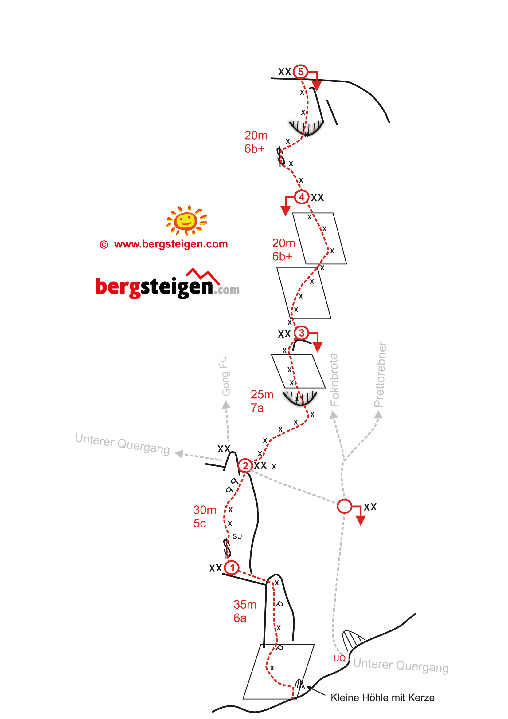 Vom Koschutahaus folgt man dem markierten Wanderweg nach Südosten Richtung Koschutnikturm. Nach etwa 50 min erreicht man ein Schotterfeld mit einem Wegweiser. 20m hinter dem Wegweiser zweigt ein Steig nach oben ab (roter Pfeil auf Stein und Beschriftung “ÖTK”). Diesen Steig das Schotterfeld hinauf bis zu einer weiteren Markierung “ÖTK” auf einem Stein. Von hier das Schotterfeld nach links über einen kleinen Pfad bis zum Wandfuß queren. Einstieg links unterhalb des Unteren Quergangs knapp links einer Minihöhle mit Kerze (Bolt in 2m Höhe).