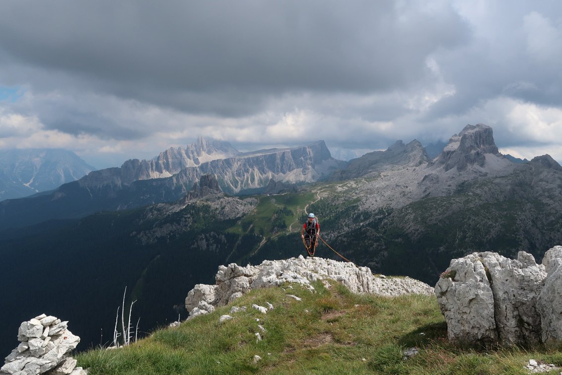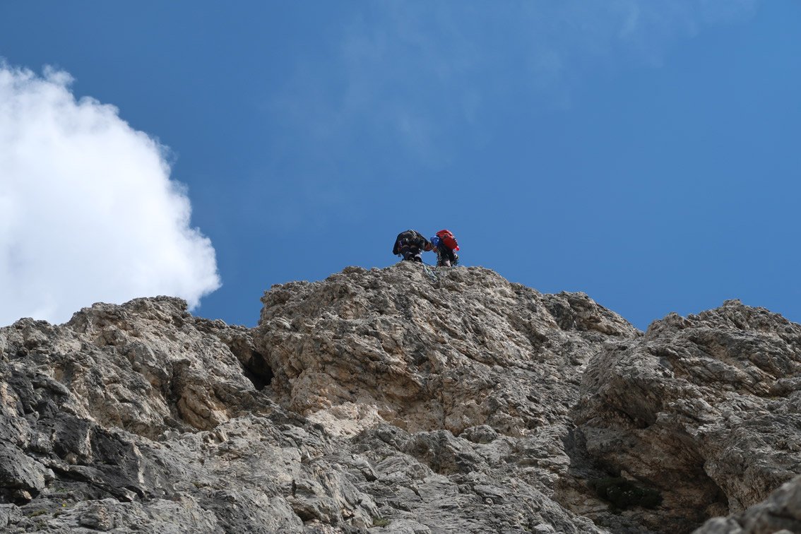 Beliebter und gut griffiger Klassiker an der Südwand des großen Falzaregoturmes. Wegen der zementierten Standplatzhaken und Zwischenhaken wird diese schöne Tour auch sehr oft von Ausbildungskursen gemacht - an schönen Tagen sind Staus möglich. Die Tour lässt sich ideal mit einer Route am kleinen Falzarego Turm (wir haben davor den schönen Bergführerweg gemacht) verbinden, da man beim Abstieg vom Kleinen Falzaregoturm genau zum Einstieg der Südwandrouten kommt.