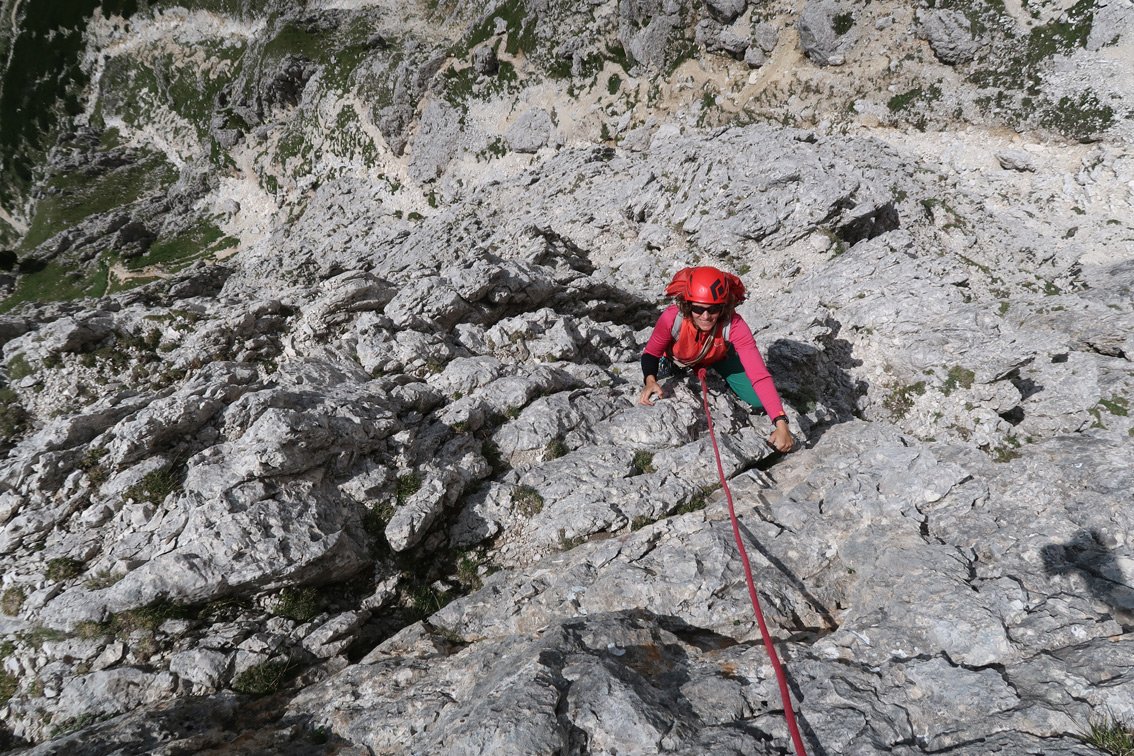 Standplätze und einige Zwischenhaken vorhanden - man muss aber im leichten Gelände teilweise recht weit zum nächsten Haken klettern. Für Dolomitenverhältnisse aber gut gesichert.