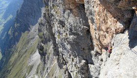 Durch die Südwand des Wildalmkirchls führt eine auffällige, teils überhängende Verschneidung zwischen „Turm“ und „Dach“. Geniale Kletterei in festem Fels und in einsamer Umgebung. Auf jeden Fall etwas für Liebhaber mobiler Sicherungsmittel und langer Zustiege.
