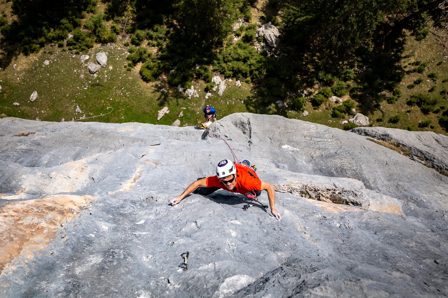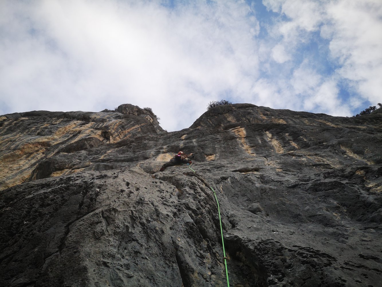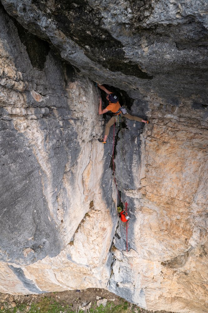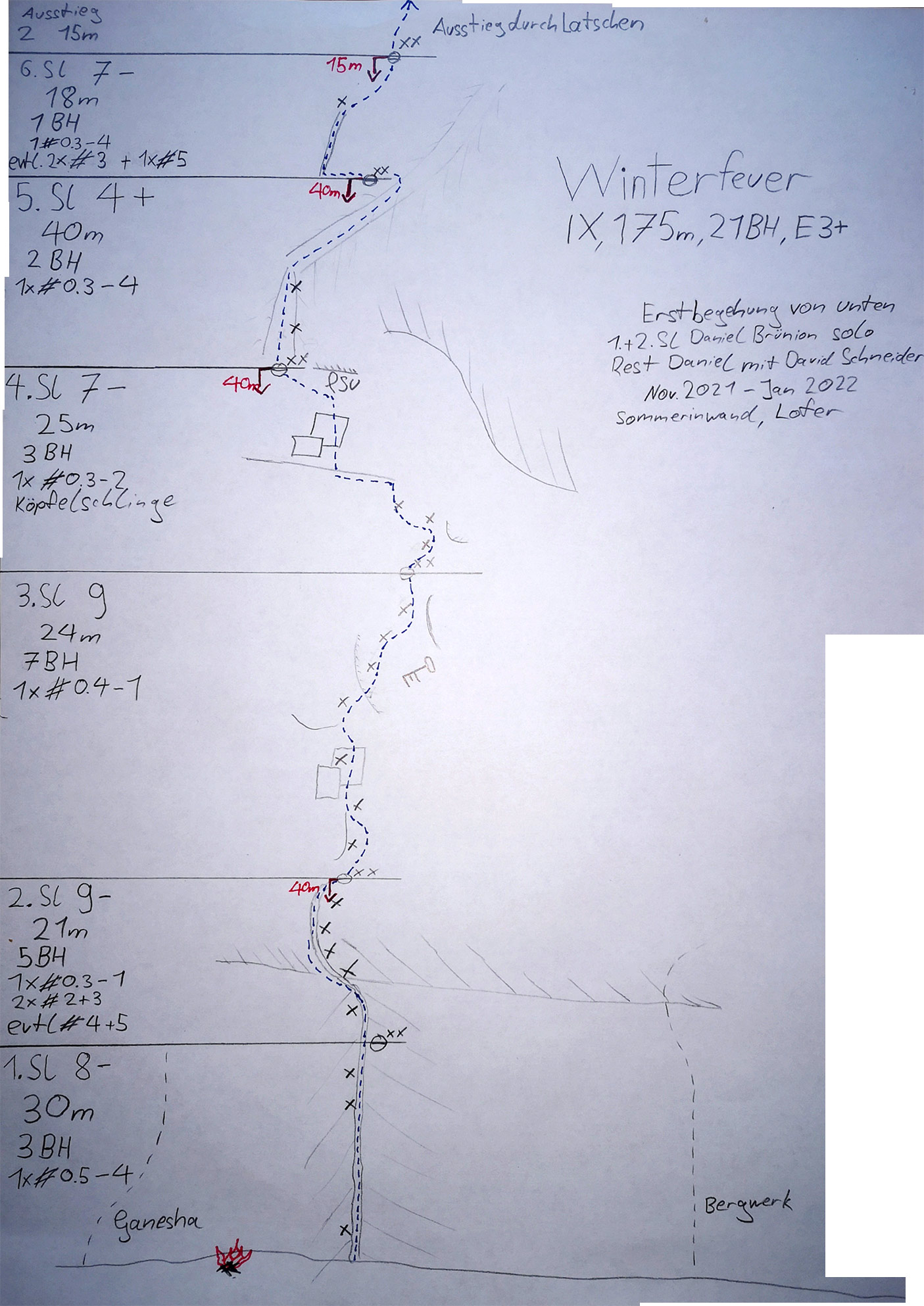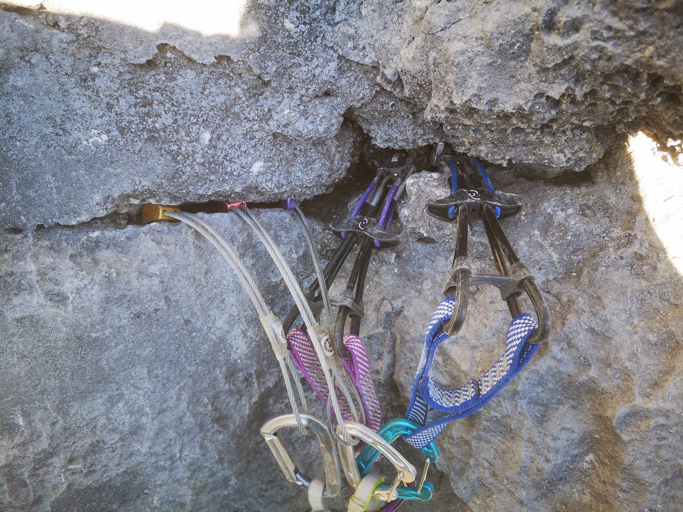 Wenn gut absicherbar möglichst wenige Bohrhaken gesetzt. Die ersten zwei Seillängen haben aufgrund der Solobegehung ein paar Bohrhaken mehr.