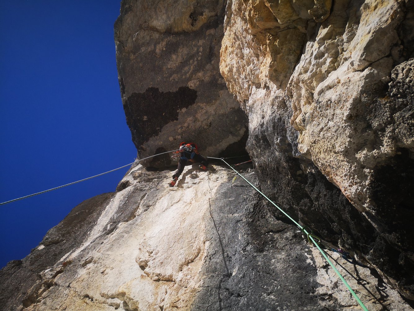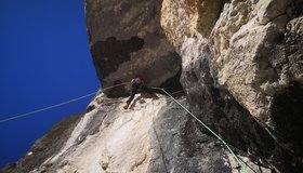 6.Sl 7- , 18 m 2m nach links bei Riss nach oben, nach Bolt rechtshalten. Bohrhakenfrei erstbegangen,BH nachträglich gesetzt