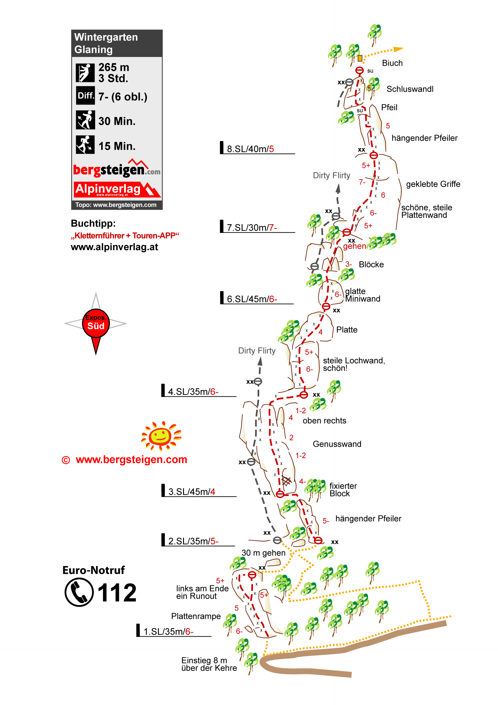 Die Route Wintergarten ist der längsten Touren am Noafer Bichl und verläuft im linken Wandbereich. Vom Tal aus betrachtet erscheint die rötliche Porphyr-Wand für Kletterer von geringem Interesse. Erst wenn man Seillänge für Seillänge klettert, erkennt man die Vielseitigkeit dieser Wand. Die Route bewegt sich mit Ausnahme der vorletzten Schlüsselseillänge recht konstant im 5-6 ten Grad. Wem die 7- zu anspruchsvoll ist, kann einfach über die Dirty Flirty aussteigen, der Stand ist wenige Meter über dem Stand unter der Schlüssellänge (siehe Toposkizze).
