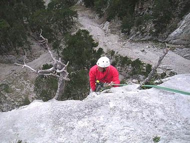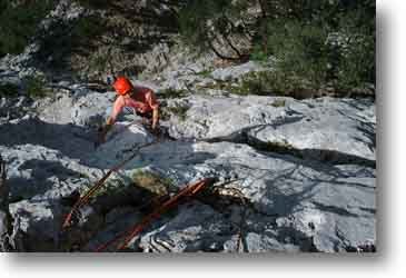 Die erste Länge führt über eine etwas splittrige Platte (aber sehr gut gesichert) auf einen Grasabsatz mit kleinen Bäumen. (Von dort gehen mehrere Touren weg). Die ganz rechte Linie über gut griffige Platten unter einen Überhang nach rechts zum Stand. Die letzte laenge quert scharf nach links (nicht gerade hinauf) und verläuft dann senkrecht nach oben zum Schlußstand.
