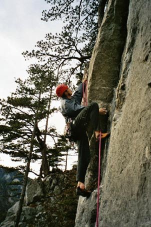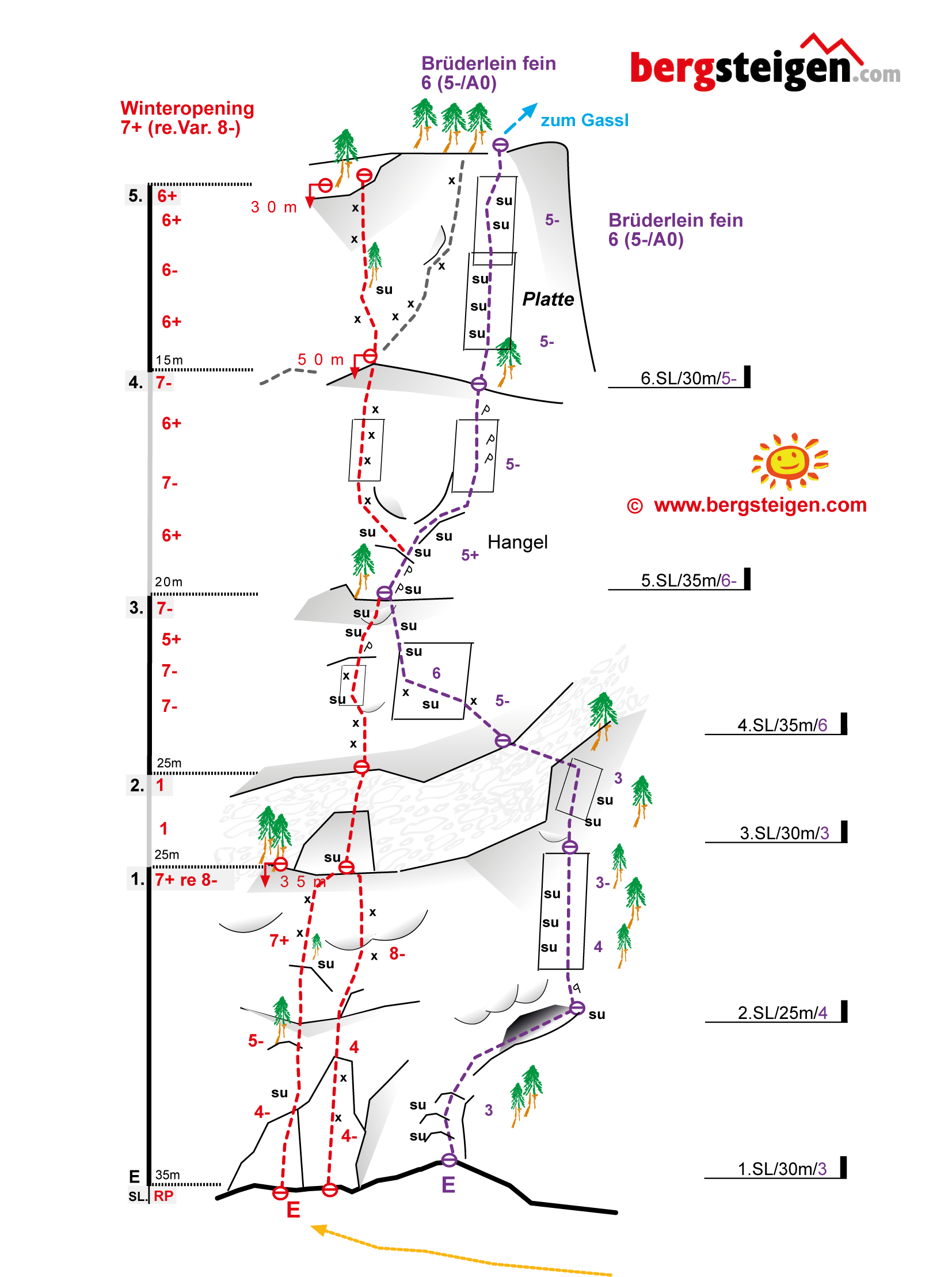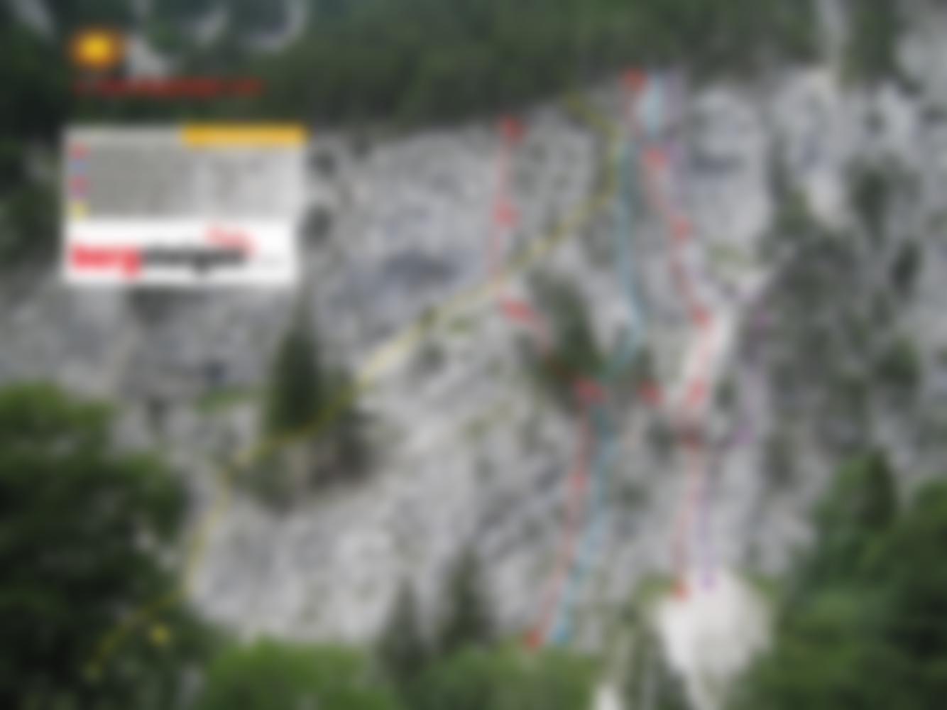 Bei der Route handelt es sich um eine nette Plattentour (Ausnahme 1. SL, rechts ein genialer, aber weiter Sprung von Henkel zu Henkel, links komische Wandstelle) in überwiegend sehr gutem Fels mit vielen Einzelstellen im Grad 7-. Die Absicherung ist gut, aber teilweise etwas weiter mit Bohrhaken und SU. Stand tw. an Bäumen, KK werden nicht benötigt aber dafür mind. zwei Schlingen. Helm unbedingt tragen. Abseilen über die Route möglich. EB tw. von unten (1. SL, 2. SL und 5. SL).