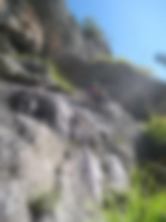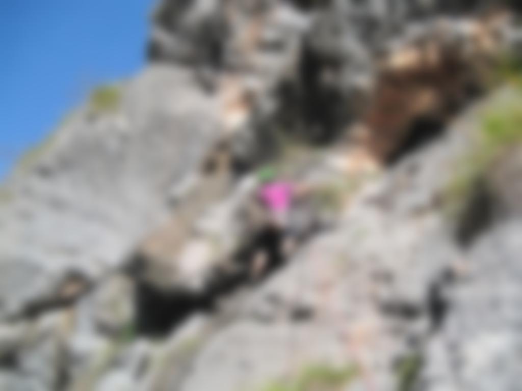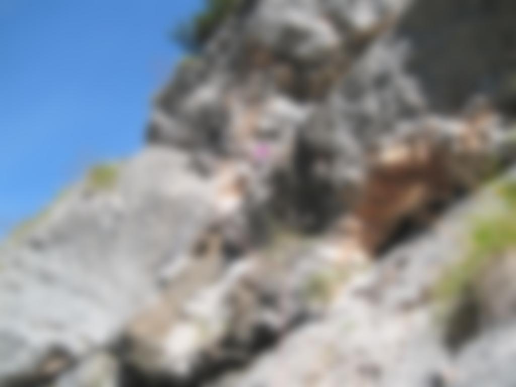 Bohrhaken, in der letzten Seillänge sichert man mit einigen Bandschlingen (die man mitbringen muss) an Bäumchen.