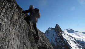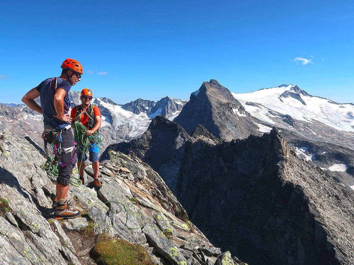 Zsigmondyspitze – auch Feldkopf genannt – wird als „Matterhorn“ des Zillertals bezeichnet. Der Anstieg über den Südgrat ist eine der beliebtesten, leichten Gratanstiege in den Zillertaler Alpen. Bei dieser wunderbaren Tour hat man auch keinen Gletscherkontakt und kann sich voll und ganz auf die anregende Blockkletterei konzentrieren. Auf dem Weg liegt, bzw. ist das bei vielen auch der Ausgangspunkt, die Berliner Hütte. Der denkmalgeschützte Bau ist noch sehr gut erhalten, man sollte auf jeden Fall einen Blick in den Speisesaal und das Treppenhaus werfen. Landschaftlich eindrucksvoll – und wenn man vom Tal kommt ein sehr langes, leichtes Kletterabenteuer im Zillertal.