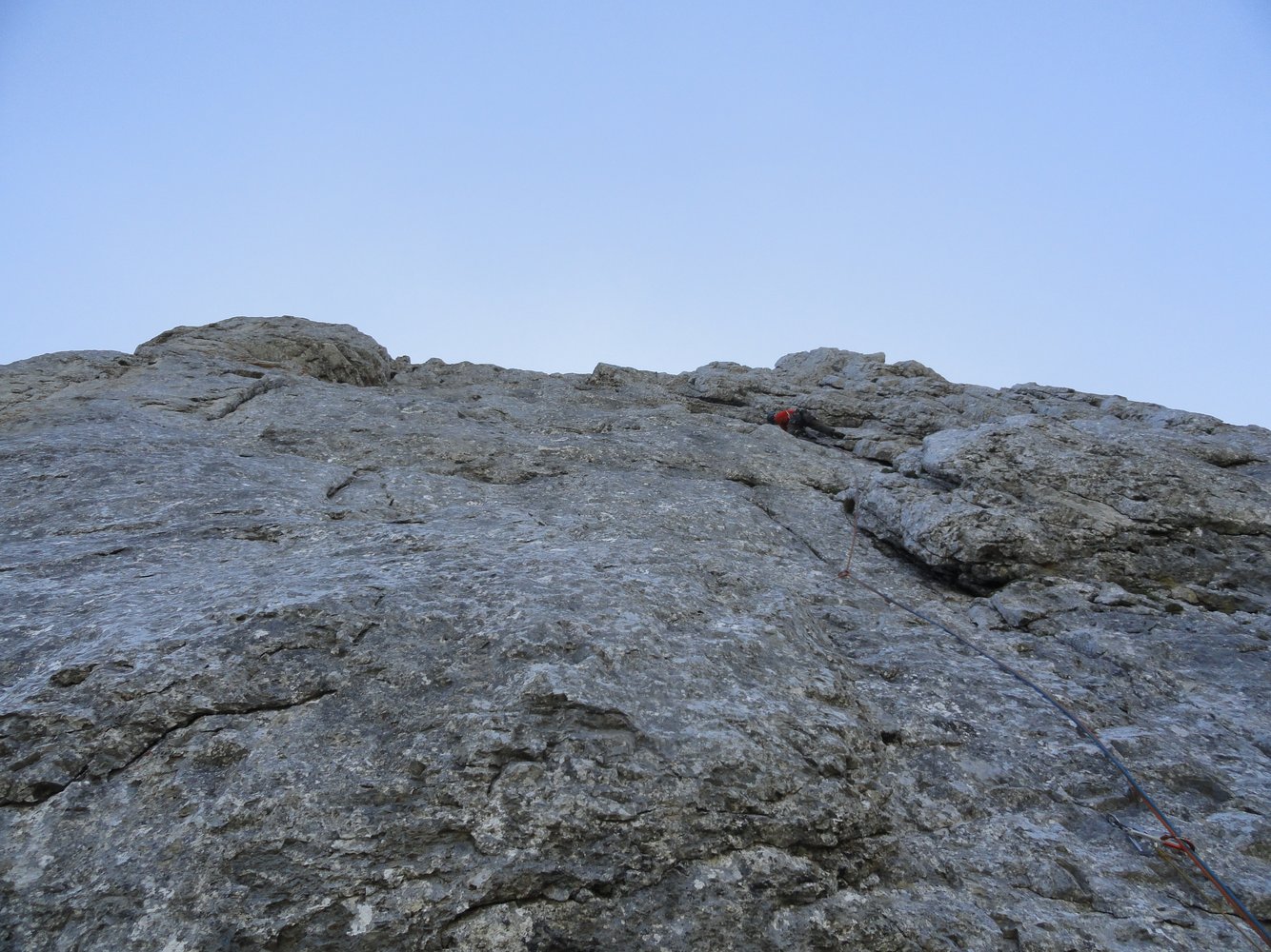 Die erste Seillänge lässt sich über leichtes Schrofengelände auch umgehen. Stand am Ende des Schrofengeländes unter der markanten Headwall bei angelehnter Schuppe.
