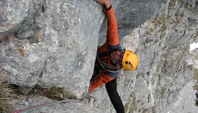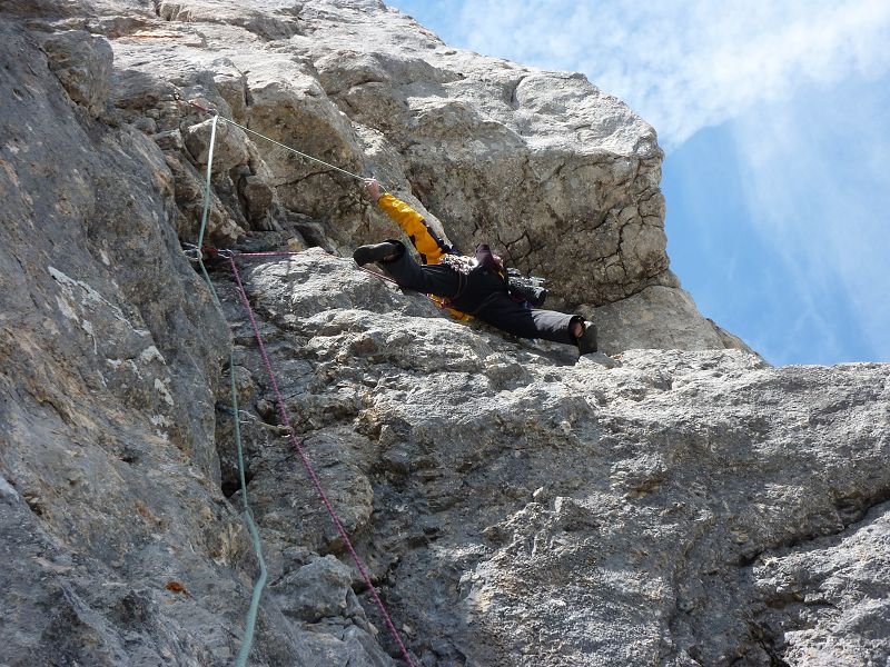 R3 = Schwer abzusichern, mit nicht immer guten Zwischensicherungen, die weit voneinander entfernt sein können. Lange zwingende Kletterpassagen. Potenzielle Sturzlänge kann über 10 Meter betragen und ein Sturz kann Verletzungen zur Folge haben.