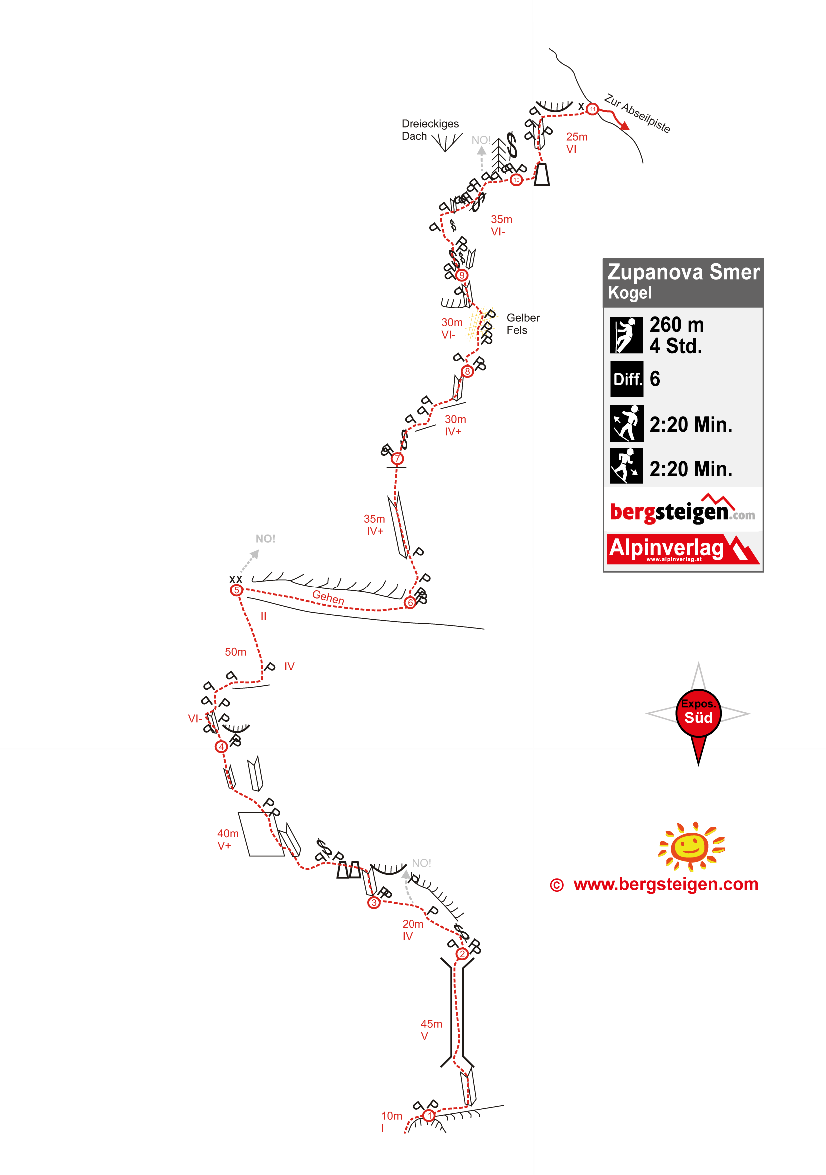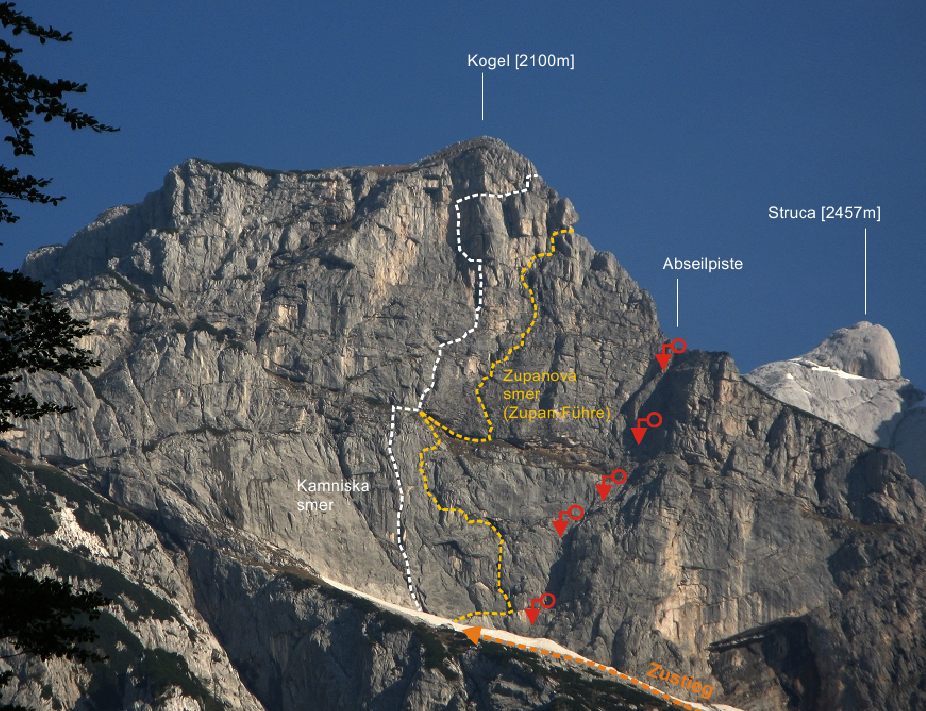 Die Zupanova Smer ist einer der bekanntesten und meistbegangenen Routen an dieser Wand, ein echter Klassiker. Die Kletterei ist abwechslungsreich und führt meist in sehr gutem Fels. Entsprechend einem vielbegangenen Klassiker stecken in den Seillängen und an den Ständen relativ viele Normalhaken, was die Tour vom alpinen Anspruch her für slowenische Verhältnisse einigermaßen moderat macht. Auf dem Band in Wandmitte kann nach rechts zur Abseilpiste gequert werden.