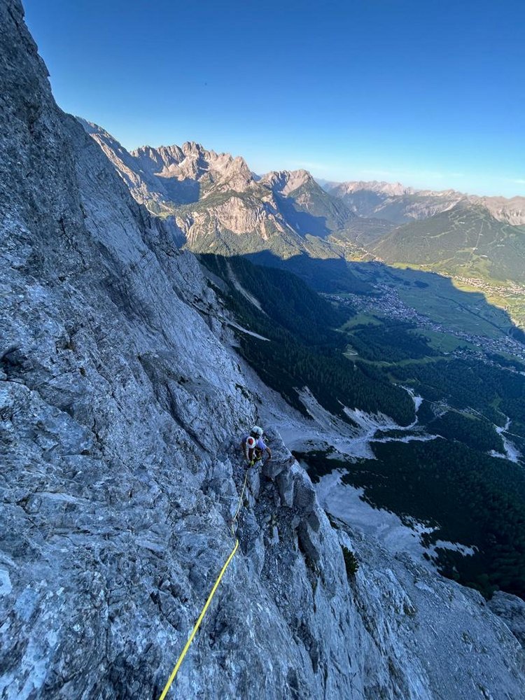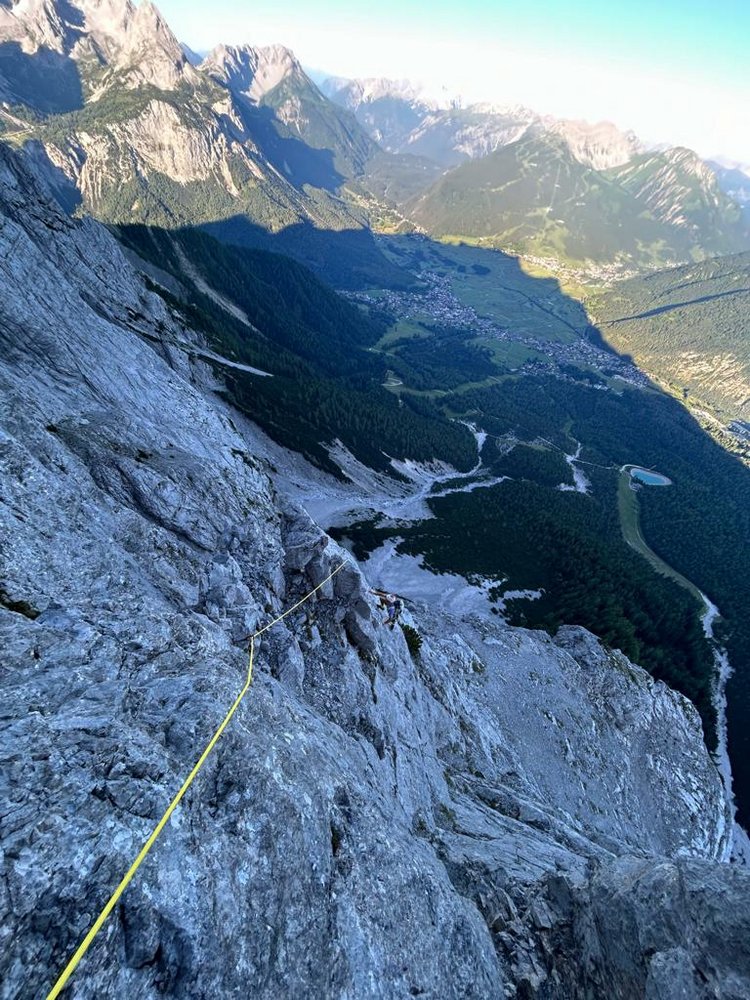 Die Route "Zwischen den Toren" ist eine logische Linie durch die Westwand des Schneefernerkopf. Alpines Gesamterlebnis, brüchiger Fels und wenige kompakte Klettermeter beschreiben diese Route recht gut. Es ist auf jeden Fall ein Erlebnis, die 1315 Klettermeter zügig zurückzulegen, wenngleich die Felsqualität im Großteil der Tour nicht immer gut ist. Die Route ist zwar durchgebohrt, der Anstieg ist aber keine Plaisiertour. Im unteren Teil, fanden wir manche Kletterpassagen wie das Testwändli sowie die Seillänge danach etwas erzwungen, diese kann man nämlich im leichten Gelände einfach umgehen (und ist so schneller am Ziel). Die Routenfindung ist nie wirklich schwer und meist sehr logisch.