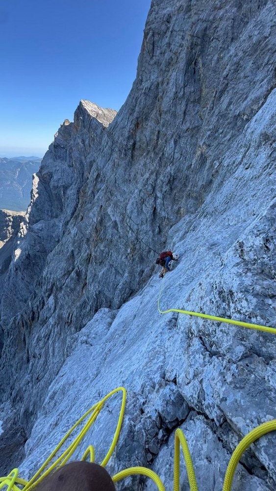 In einigen Beschreibungen steht, dass die beiden Schlüssellängen wegen Seilzug fast nicht zu klettern sind, wenn man aber gut auf den Seilverlauf achtet und die Expressschlingen verlängert, hat man auch mit Einfachseil hier kein Problem.