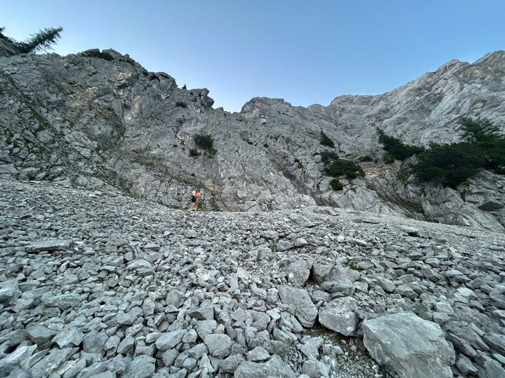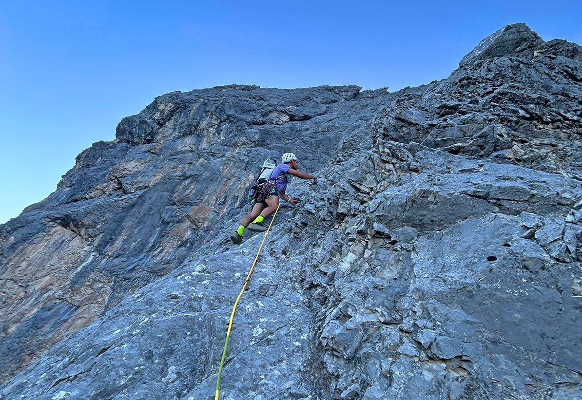 Der Großteil der Route ist im 4. und 5. Schwierigkeitsgrad, den man aber zügig und sicher klettern sollte. Es ist sehr viel Bruch in der Route, also man muss wirklich von unten bis oben bei der Sache sein und nicht jedem Griff und Tritt blind vertrauen.