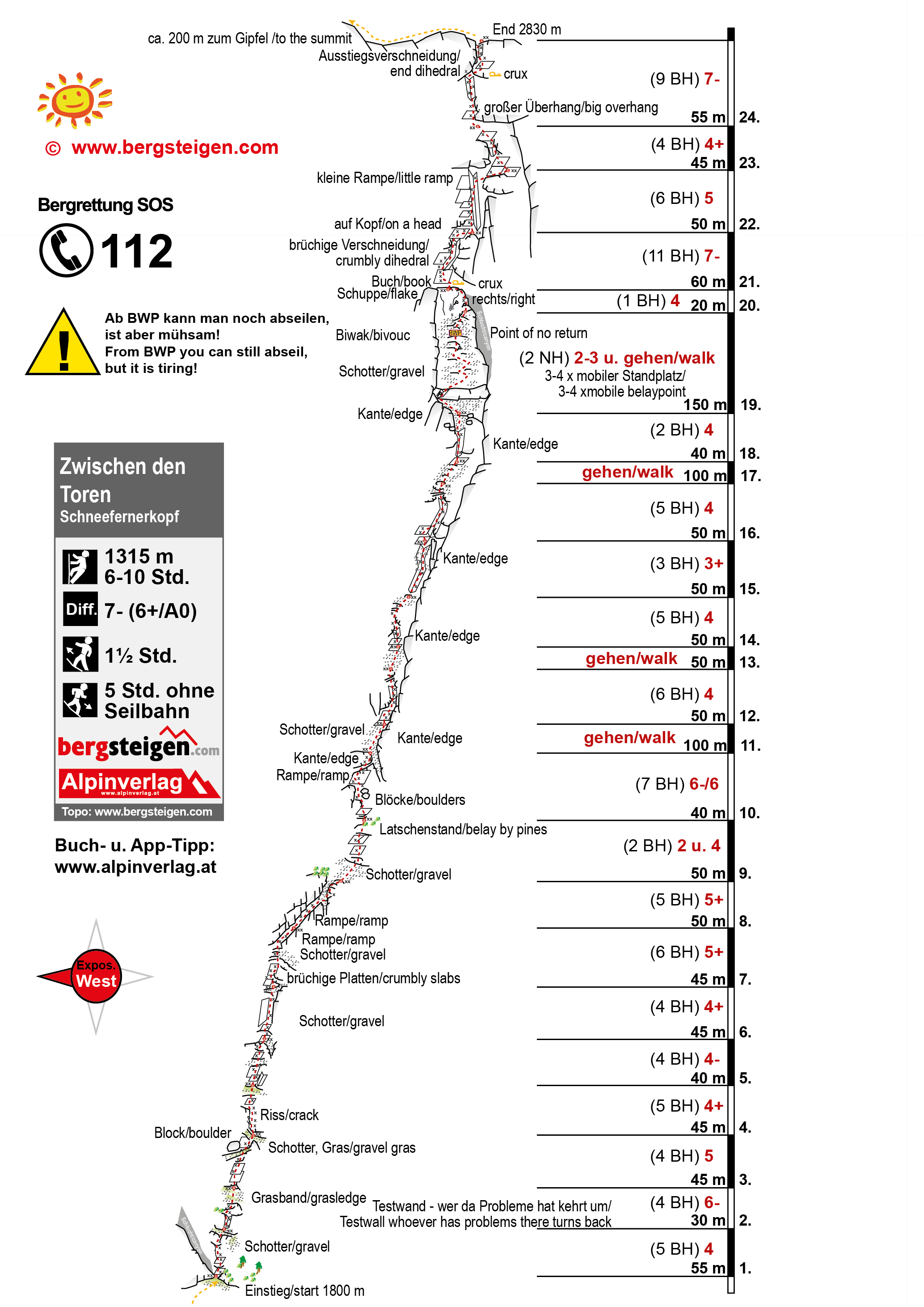 Laut anderen Führern sind die "Biwakplätze" der Point of no return und man kann hier in 4h abseilen - von dem ist aber abzuraten und man sollte wirklich nur im schlimmsten Notfall hier abseilen - man würde hier 20SL flaches Schotter/ 4er-Gelände abseilen. Besser nach oben fertig klettern oder wenn man unten schon Probleme hat, besser unten schon umdrehen.