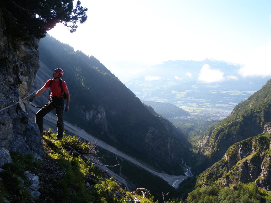 Der Absamer Klettersteig ist ein moderner Hüttenklettersteig mit dem Ziel Bettelwurfhütte hoch oben im Halltal. Tolle landschaftliche Eindrücke wechseln mit anregenden Kletterstellen an den südseitigen Felsen unterhalb der Bettelwurfhütte. Die Ferrata hat trotz des kurzen Zustieges gewaltigen Alpincharakter - fast 1000 Klicks (Umhängen des Klettersteigsets) sind nötig um nach ca. 1300 Klettermetern und genau 600 Hm den Ausstieg zu erreichen. Obwohl das Gestein nicht immer ganz kompakt ist, wurde von den Erbauern eine tolle Linie durch die mächtige Plattenwand gelegt. Eindrucksvolle Schluchtquerungen, schöne Steilpassagen, originelle Klemmblöcke und eine gewaltige Anzahl von Höhenmetern sorgen für ein sehr gutes Gesamtpaket für den Klettersteiggeher. Selten kommt man so schnell aus dem Stadtgebiet in eine fantastische alpine Landschaft wie an dieser Steiganlage! Ein weiters Highlight ist die Bettelwurfhütte am Ende der Tour. Eine urige, aber trotzdem moderne Schutzhütte mit kulinarischen Highlights, wie selbst gemachte Nudeln oder im Ofen vor der Hütte gebackenes Brot - geradezu ideal für die gemütliche Rast vor dem Talabstieg. Wer über Nacht bleibt sieht das einzigartige Lichtermeer im Inntal und kann noch die Bettelwurfüberschreitung (sehr alpiner Klettersteig bis D) anhängen, mit etwas Wetterglück reicht der Blick vom Gipfel sogar bis nach München.