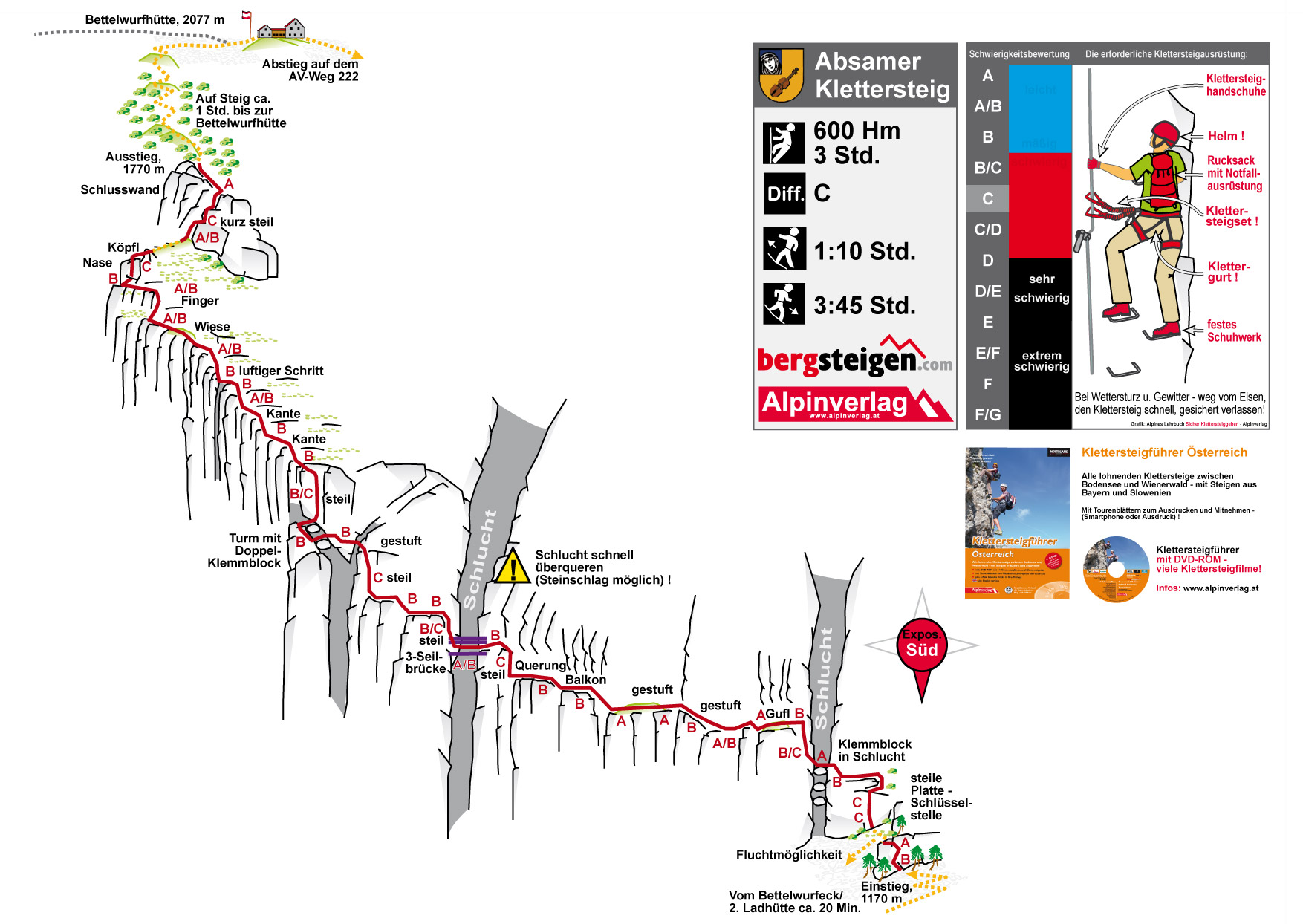Langer Klettersteig 600 Hm, fast 1000 mal Umhängen, den man nicht unterschätzen sollte. Vom Steigende sind es noch ca. 1 Std. Aufstieg bis zur Bettelwurfhütte, gesamt also 1000 Hm. Wegen der südseitigen Lage sollte genug zu trinken mitgenommen werden! Der Steig ist nur in der Zeit von 1. Mai bis 1. Nov. begehbar.