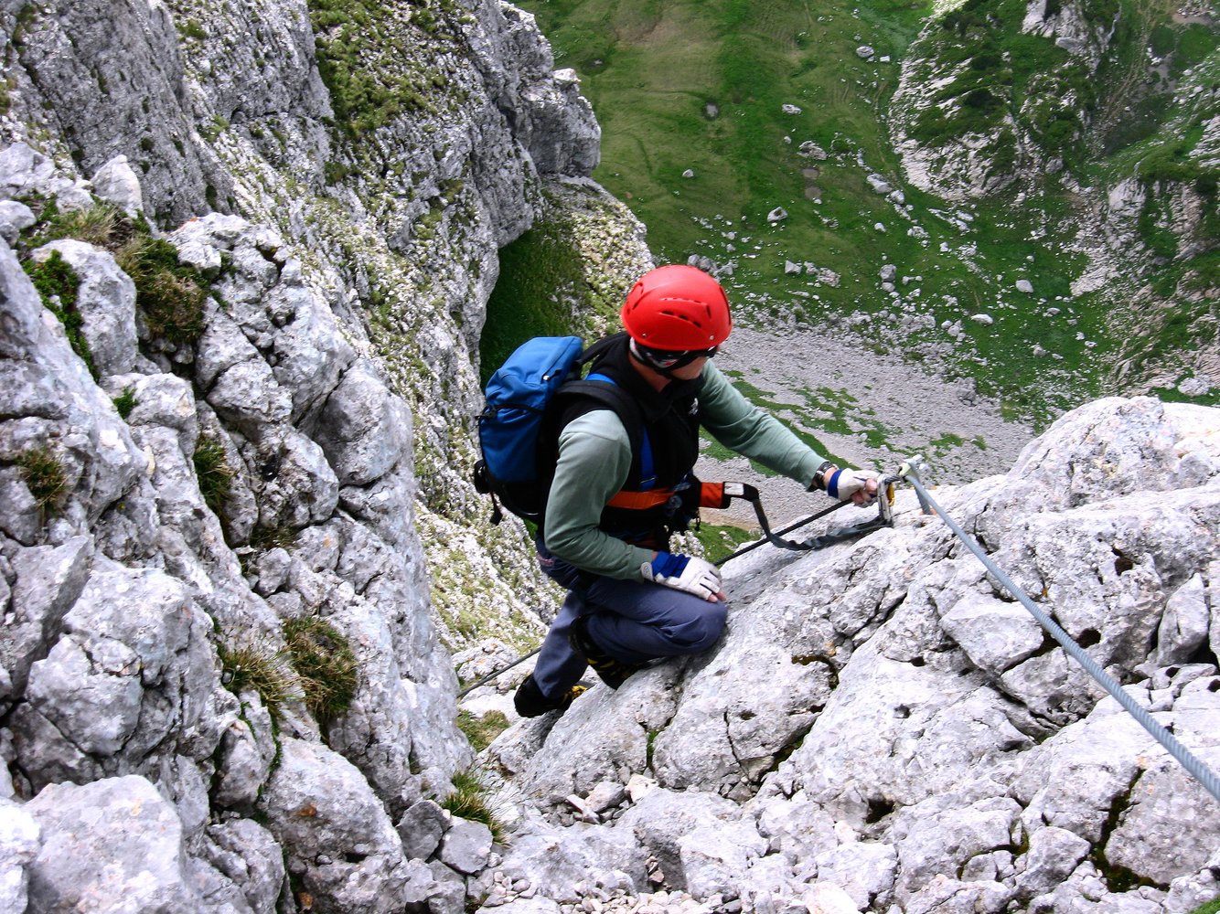 Komplette Klettersteigausrüstung und Helm; für schwächere Geher und Kinder ein kurzes Sicherungsseil.