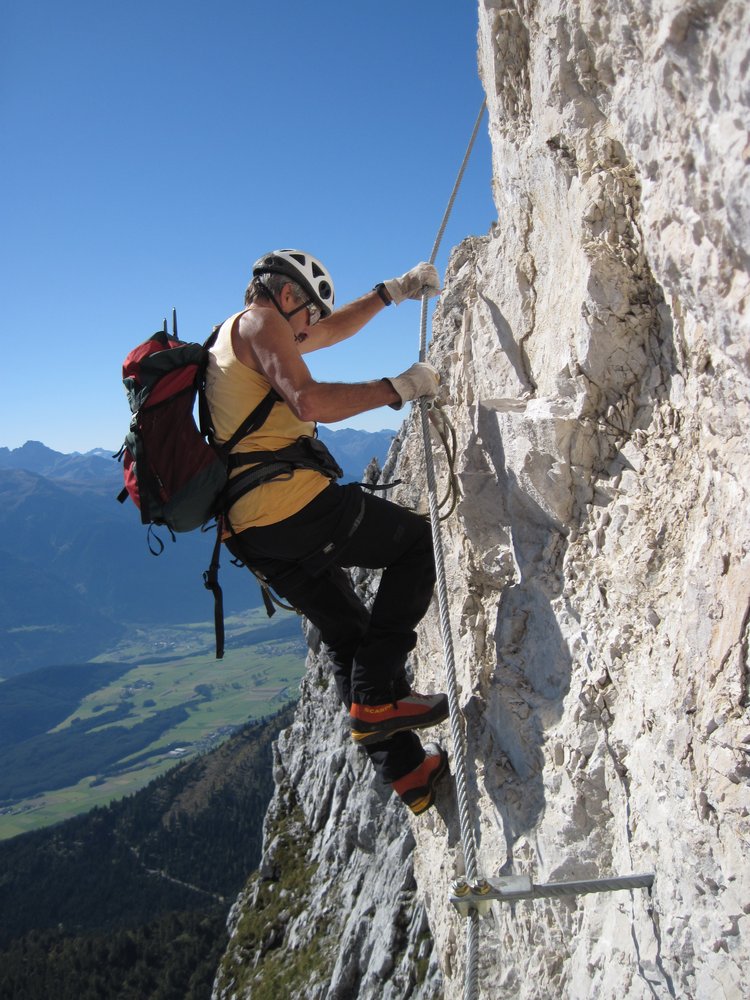 Schöner, langer Klettersteig auf den Karkopf. Der Klettersteig verläuft im Bereich des Ostgrates bzw. in den steilen Felswänden an dessen Südseite. Schwere und recht luftige Kletterpassagen halten mit leichten aber aussichtsreichen Gratpassagen die Waage und so erreicht man – im Blick immer das Inntal, die Hohe Munde und die Zugspitze – nach ca.2,5 Std. den Ausstieg. Die Erbauer haben recht originelle Passagen geschaffen, die Palette reicht von glatten Platten, steilen Pfeilern mit Klammern, Löchern (Adlerauge) bis hin zu luftigen Querungen. Ganz im Stil moderner Sportklettersteige wurde eine abwechslungsreiche Route geschaffen, die schon vor der geplanten Eröffnung im Oktober 2008 zahlreiche Ferratisten in ihren Bann zog.
