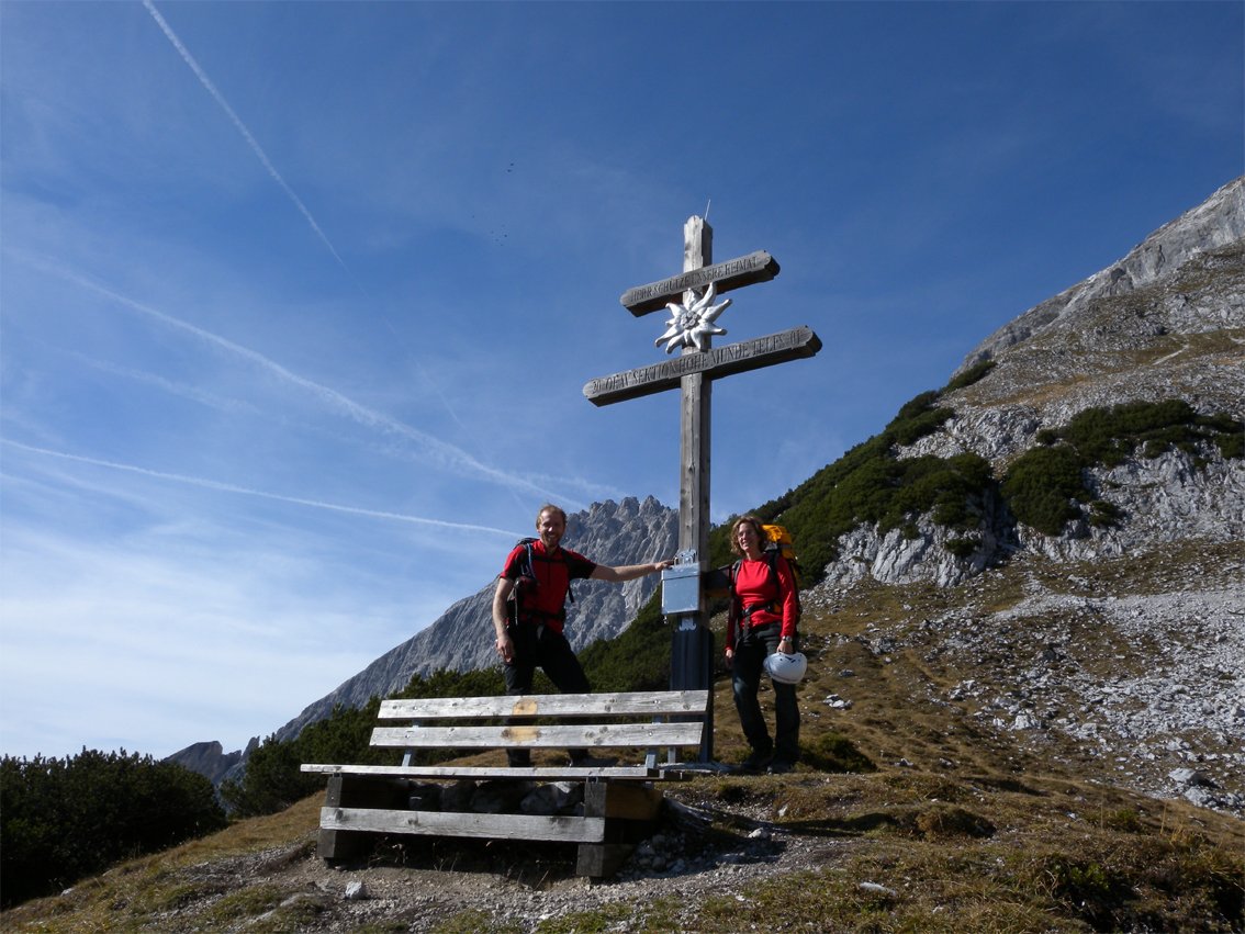 Vom Steigende folgt man dem anfangs schmalen Grat bis dieser breiter wird - dort kommt von links der Normalanstieg dazu. Zum Gipfel folgt man dem Grat, umrundet eine Felsblock mit Tafeln links und steigt steil (Drahtseile) zum höchsten Punkt mit dem Kreuz. Wieder retour und auf dem Normalweg hinunter zum Wetterkreuz (kurze heikle Plattenpassage vor der großen Schutthalde über dem Wetterkreuz). Von diesem weiter zur Neuen Alplhütte (1504 m) und von dieser hinunter zum Strassberghaus bzw. Parkplatz.