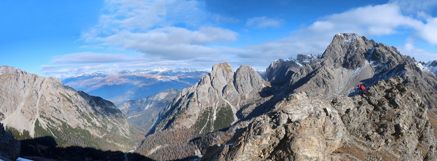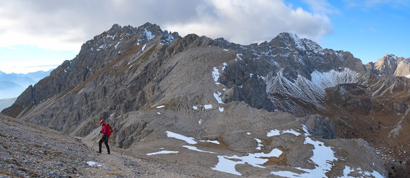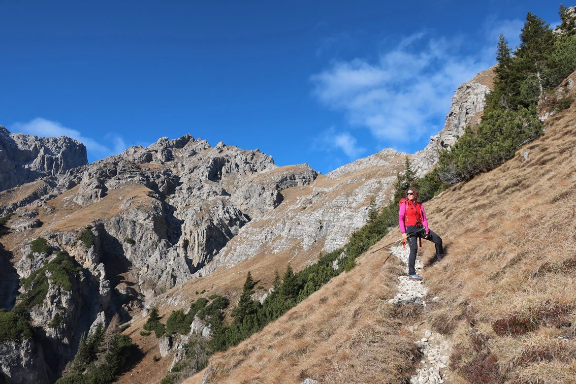 Es gibt ein paar ungesicherte Passagen, Trittsicherheit und Schwindelfreiheit und ein gewisses Maß an alpiner Erfahrung nötig. Vor allem in der Gipfelwand auf Steinschlag achten.