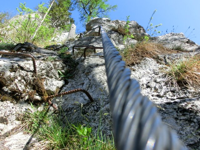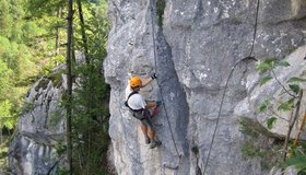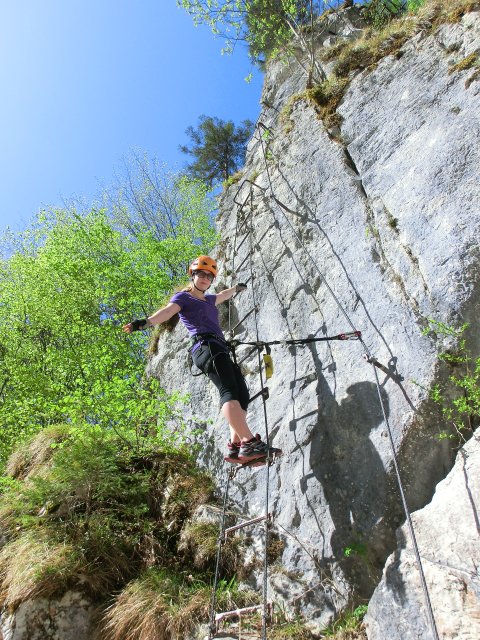 „Da legt’s di nida…“ ist der erste Gedanke, der einem beim Anblick der extrem überhängenden Seilleiter in den Kopf schießt. Doch nach einigen beherzten Zügen hat man eine der schwersten Klettersteigstellen Österreichs überwunden. Den Erbauern ist es gelungen, einen eindrucksvollen Abenteuerpark mitten im Nationalpark Gesäuse zu schaffen. Drei unterschiedlich schwere „Klettersteige“ führen unmittelbar neben der Straße nach oben. Dank des kurzen Zu- und Abstieges eine schöne Bereicherung für das Tal.