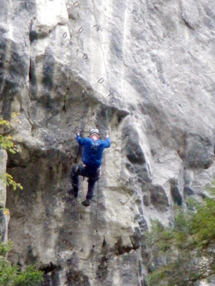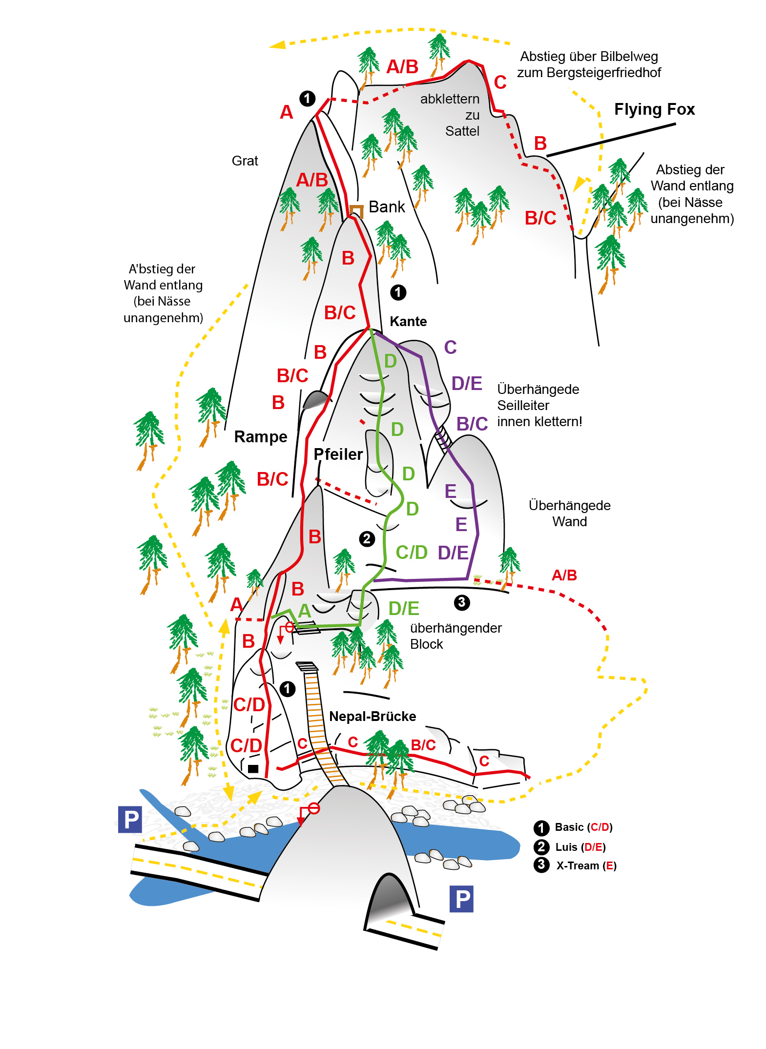 X-treme Variante (E), schwere Variante - Luis D/E. Leichte Basic Variante mit Einstiegsüberhäng (C/D). Leichetester Weg (C) mit rechter Einstiegsvarante