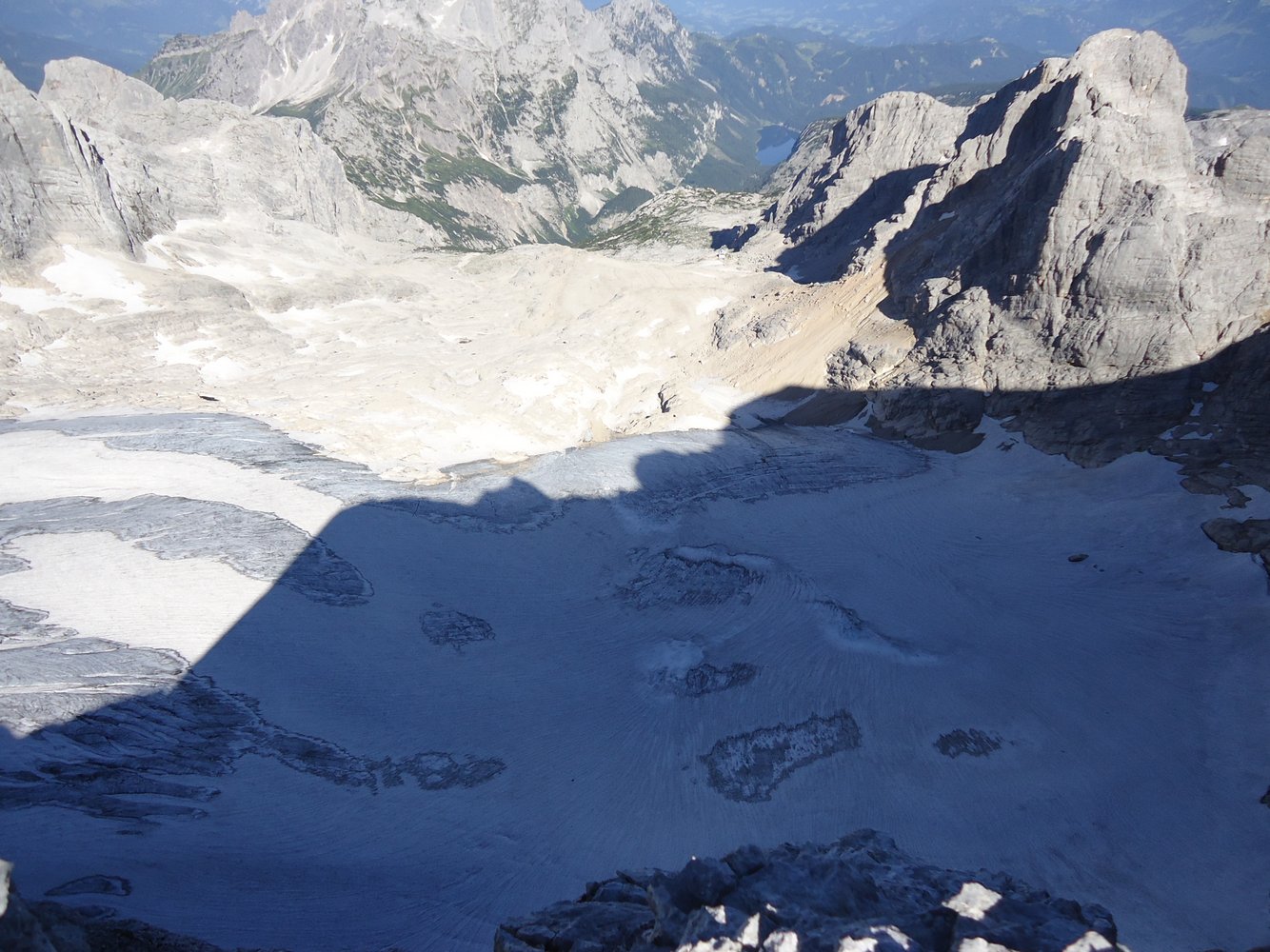 Von der Adamekhütte (dorthin in ca. 4,5 Stunden) kurz in Richtung Dachstein, dann gerade zum Gletscherlehrpfad (Gr. Gosaugletscher) und weiter auf dem Gletscher an die NW-Wand des Hohen Kreuzes. Der Einstieg ist bei einer höhlenartigen Nische unter einer steilen, wasserzerfressenen Wandzone.