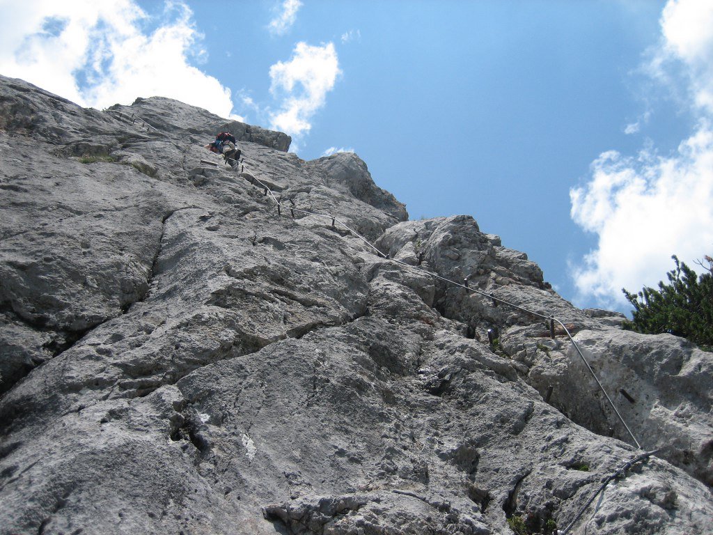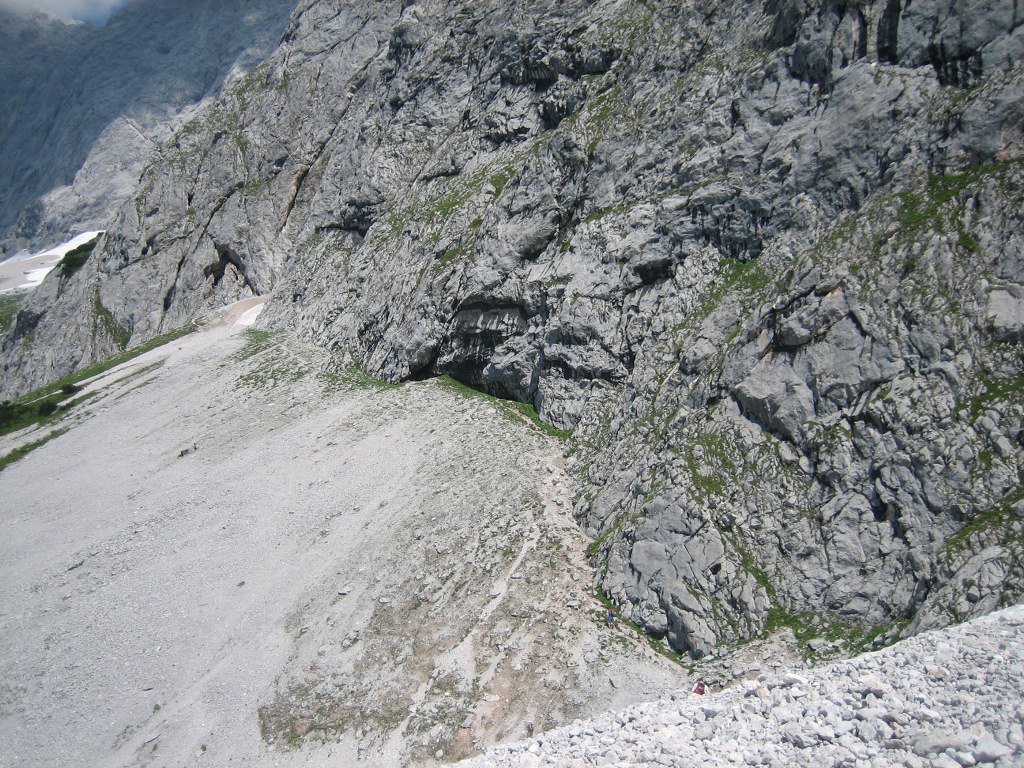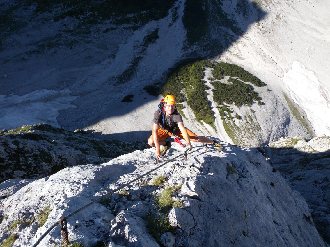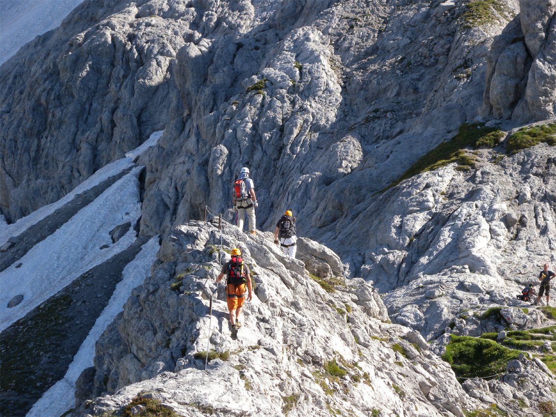 Kompl. Klettersteigausrüstung und Helm (siehe oben!). Beim Zustieg im Frühjahr sollten die Altschneefelder nicht unterschätzt werden (Leichtsteigeisen u. Pickel).