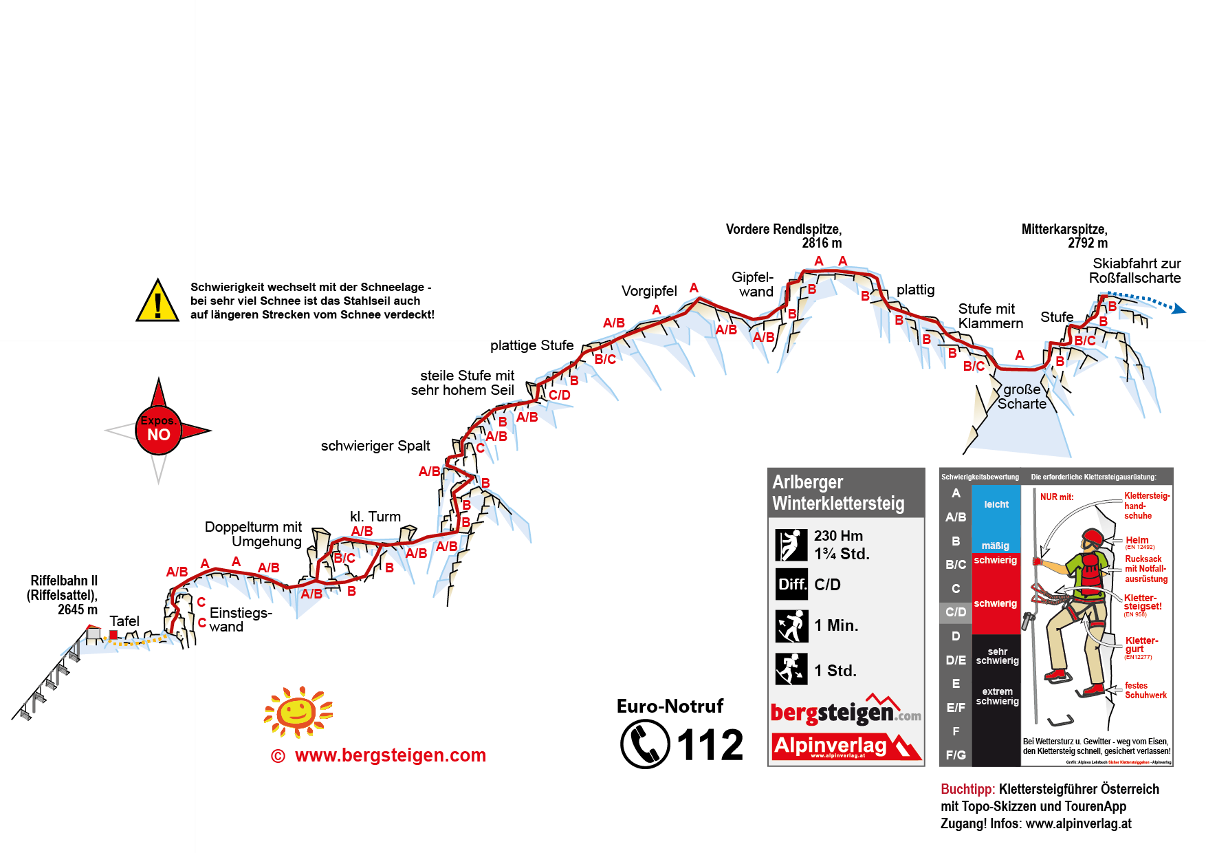Schwieriger Klettersteig (eine Stelle C/D); alpine Erfahrung nötig. Je nach Schneelage kann es vorkommen, dass weitere Strecken ohne Sicherungsseil (Stapfen im Schnee, tlw. steiler) bewältigt werden müssen.