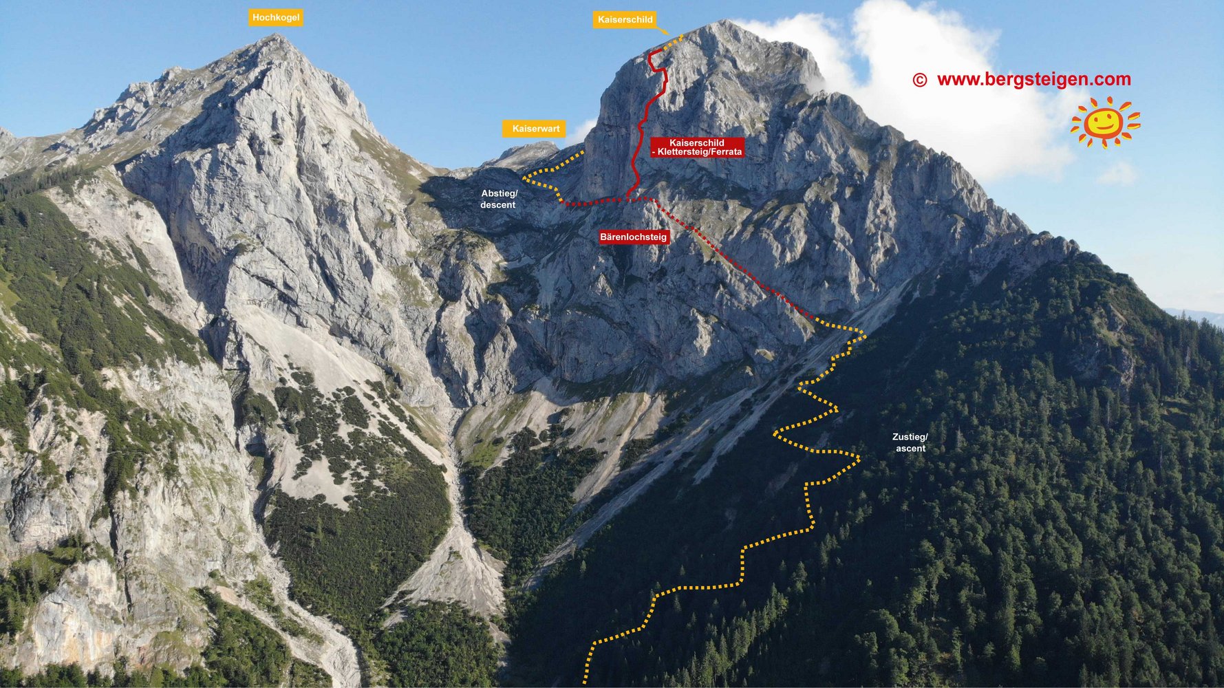 Durch den Kaiserschild Klettersteig herrscht auf dem Bärenlochsteig im Bereich des Kaiserschild-Klettersteig (Zu- und Abstiegsweg) sehr große Steinschlaggefahr – den Helm am besten am Beginn und bis zum Ende der Drahtseilsicherung aufsetzen.