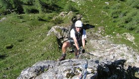 Komplettes Klettersteigset und Helm, für schwächere Geher ein Sicherungseil.