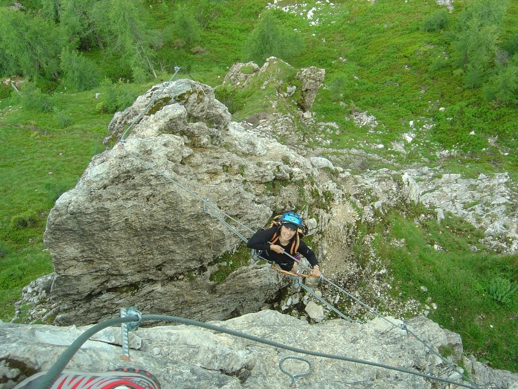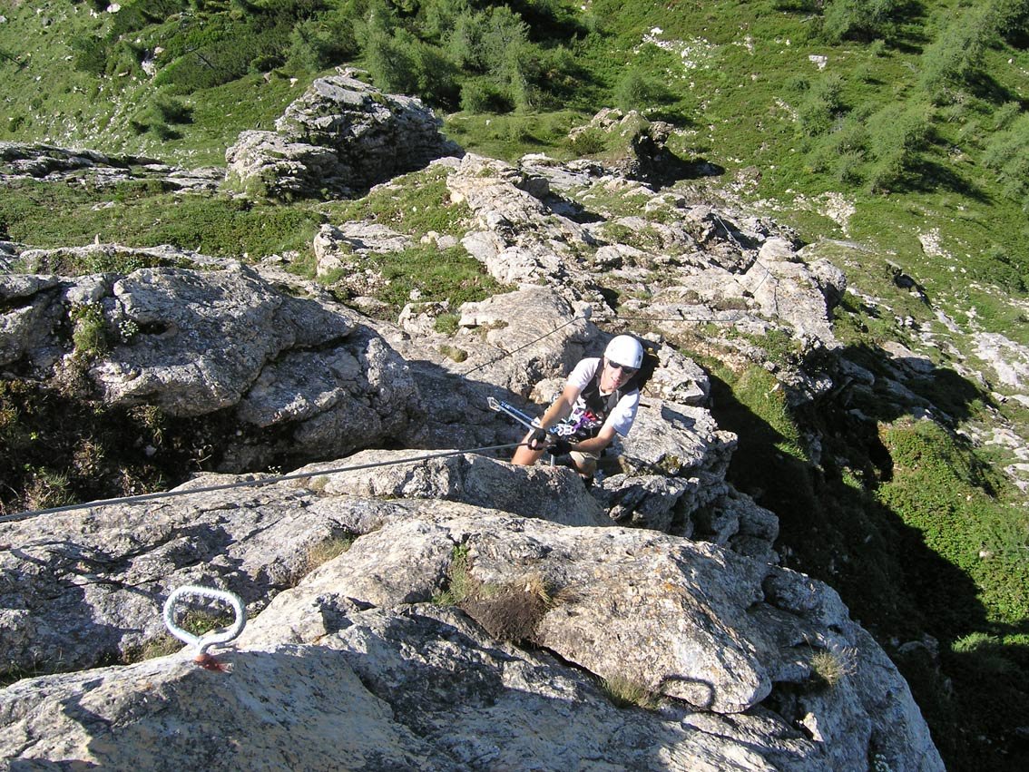 Vom Einstieg zuerst über den Pfeilersockel aufwärts (C/D) bis man dann rechts der leicht überhängenden Pfeilerkante (D) die Schlüsselstelle (D/E) kurz vor dem Pfeilerkopf erreicht. Nun über die kleine Zweiseilbrücke (B) an die Hauptwand und anfangs steil (C/D) in eine Plattenpassage (B bis C). Über eine kleine Kante (C/D) in ein Flachstück (B) vor dem letzten Aufschwung. Über diesen aufwärts (C/D) ins flache Gelände (A) bis zum Ende des Stahlseils.
