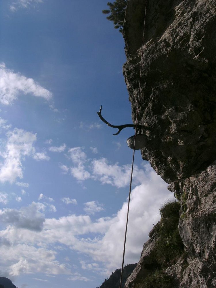An der Pfeilerwand hinauf (C, Stellen C/D), bis man oben zur Seilbrücke quert. Über die Seilbrücke (B), an die Hauptwand. Eine leichte Querung (A) führt links zu einem Überhang (D). Nach dieser kurzen D-Passage klettert man in S-Linie (C/D) zu einem Flachstück (A/B). Eine Querung (A) und mehrere Stufen (B/C) führen zur zweiten Seilbrücke (B), danach kurz steil (B/C), dann leicht (A) hinauf zum Ausstieg.