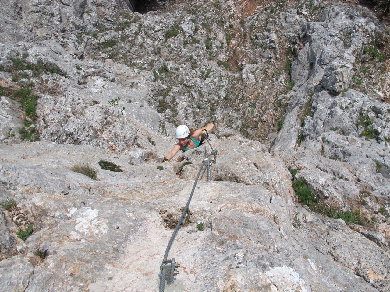 Anfangs C und später extrem anstrengend mit Hilfe eines Stahlseils und Trittstiften im Abstand von zirka einem Meter hoch (D/E). Nach dem Überhang (E), der die Schlüsselstelle darstellt, wird das Gelände leichter (C). Einige Meter im leichten Gelände (A) bringen zu einer abdrängenden und sehr ausgesetzten Querung (C/D). Der zweite Aufschwung beginnt mit einem Überhang (C/D). Ohne weitere Schwierigkeiten (B/C) wird der Ausstieg direkt bei der Windfahne der Sonnenuhrwand erreicht.