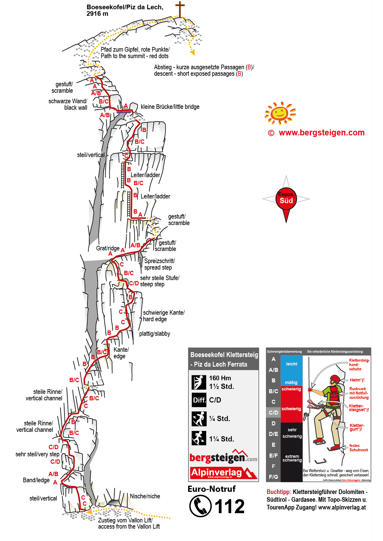 Boèseekofel-Klettersteig: Über einen kleinen Aufschwung (C) links auf ein Band (A) und gleich wieder zurück durch eine kurze Rinne hinauf zu einer Wandstufe, die schwierig (glatt und nur Sicherungsseil, C und C/D) überwunden wird. Weiter an der Wand rechts des großen Spaltes aufwärts (B) und bald plattig (B) nach rechts um die Kante auf einen kleinen Absatz queren. Dort gerade durch eine Rinne aufwärts (B) zu einer kleinen, extrem steilen und trittarmen (C/D) Wandstufe, die auf das große Band rechts der Leiter führt. Über die erste lange Leiter hinauf (B) und über die überhängende Felsstufe an Klammern (schwierig, B/C) zur nächsten, etwas leichteren Leiter (B), die zur letzten sehr schweren Klammernpassage (C) führt, die auf einem Absatz endet. Wenige Meter aufwärts (B, dann leichter) auf das Gipfelschuttfeld und in ca. ½ Std. auf einer Wegspur zum Gipfel. Normalweg (auch Abtieg nach der Ferrata): Von der Bergstation Boè Gondelbahn rechts haltend auf dem Weg 646 an der Nordseite des Berghanges vorbei, bis flacheres Gelände einen Durchstieg (stellenweise versichert, kurz B und eine Leiter) auf den Kamm oberhalb des Boè-Sees erlaubt. Oben angekommen, kann man den schönen Blick auf den tief unten liegenden See genießen. Weiter dem Kamm entlang in eine flache Scharte, 2629 m und gleich danach über eine kurze, aber steile Wandstufe (Schlüsselstelle B) an Klammern hinauf zum flachen Gipfelhang, dem man noch eine gute ½ Std. über Geröll zum höchsten Punkt folgt (Bergstation der Boè Bahn – Gipfel, B 715 Hm, 2 ½ Std.).
