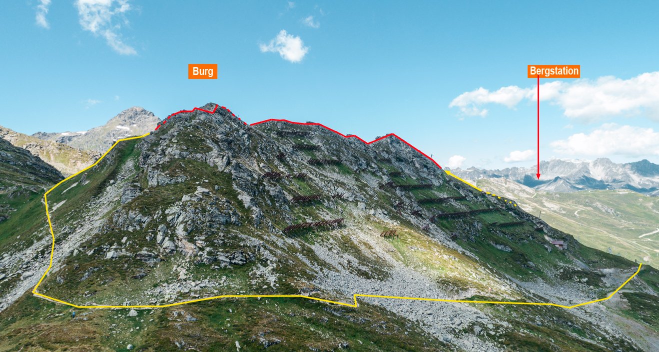 Von der Versettla Bahn Bergstation entlang eines Pfades direkt hinauf zum Einstieg des Burgklettersteiges.