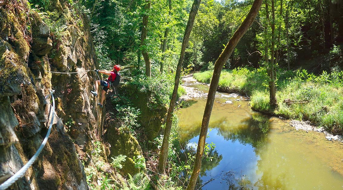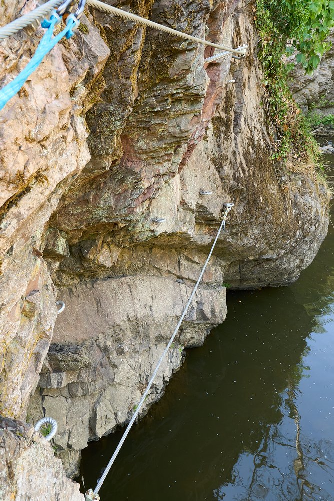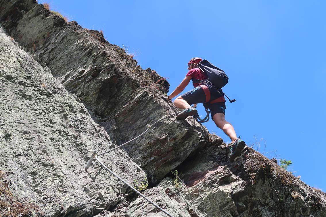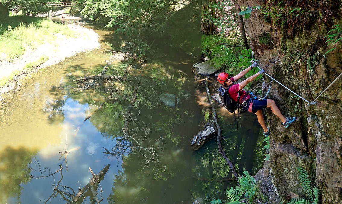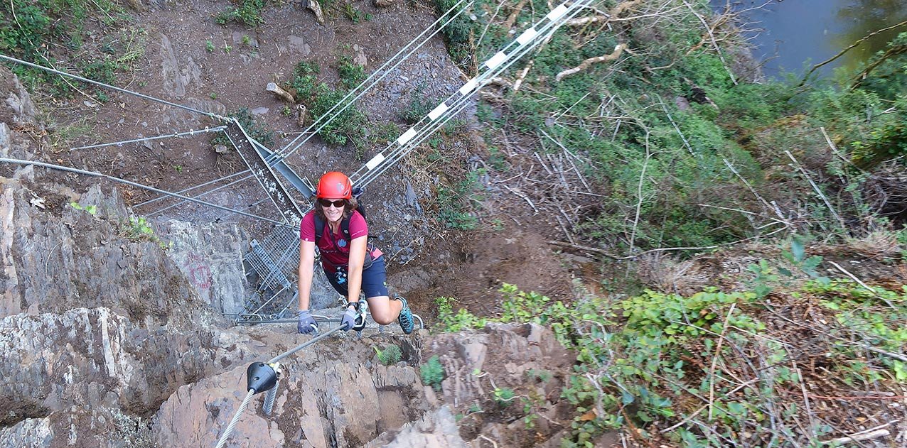 Der Burgenklettersteig in Manderscheid ist der beste, nicht alpine Klettersteig Deutschlands! Die Ferratatour hat einfach alles, was ein wirklich guter Klettersteig braucht - tolle Landschaft (schöne Stadt, meist am Bach, Vulkaneifel pur), geschichtliche Highlights (Ober- und Niederburg, alte Ritterpfade) und interessante, teilweise auch recht knackige Klettersteigpassagen. Bei dieser Ferrata quert man primär an den Felsen entlang, natürlich gibt es auch steile Vertikalpassagen - der Schlüssel zum Erfolg ist oft etwas tricky, man muss links und rechts nach guten Tritten für die Füße Ausschau halten. Sicher rinnt einem nach der geschafften, recht langen Klettersteigtour etwas der Schweiß von der Stirn oder es schlottern auf der 60-Meter-Burgenbrücke sogar ein wenig die Knie, aber man hat am Ende, beim sogenannten Kaisertempelchen, ein tolles Glücksgefühl und kann noch einmal den schönen Ausblick auf die Eifel-Landschaft und die zwei Burgen genießen.