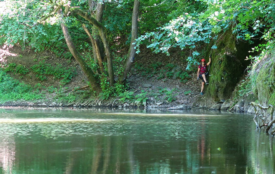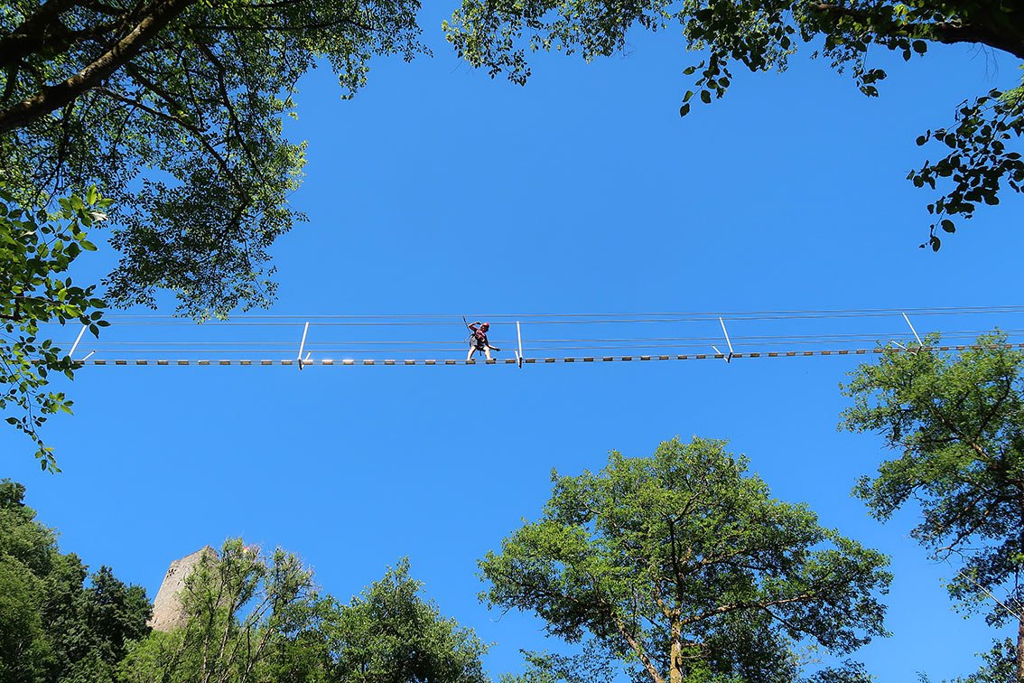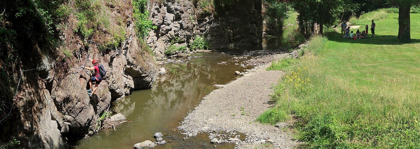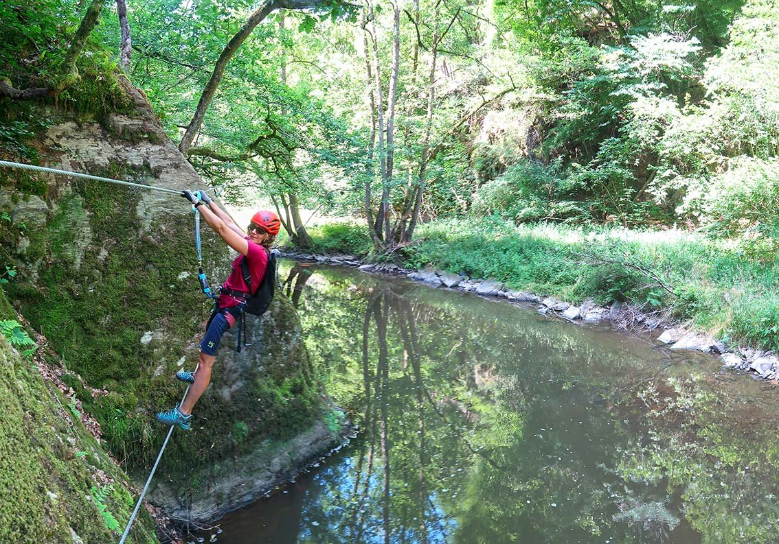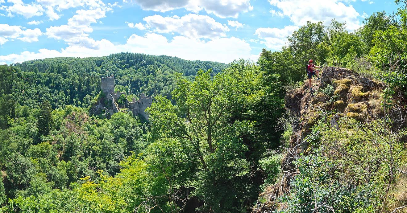 Der Burgenklettersteig in Manderscheid ist der beste, nicht alpine Klettersteig Deutschlands! Die Ferratatour hat einfach alles, was ein wirklich guter Klettersteig braucht - tolle Landschaft (schöne Stadt, meist am Bach, Vulkaneifel pur), geschichtliche Highlights (Ober- und Niederburg, alte Ritterpfade) und interessante, teilweise auch recht knackige Klettersteigpassagen. Bei dieser Ferrata quert man primär an den Felsen entlang, natürlich gibt es auch steile Vertikalpassagen - der Schlüssel zum Erfolg ist oft etwas tricky, man muss links und rechts nach guten Tritten für die Füße Ausschau halten. Sicher rinnt einem nach der geschafften, recht langen Klettersteigtour etwas der Schweiß von der Stirn oder es schlottern auf der 60-Meter-Burgenbrücke sogar ein wenig die Knie, aber man hat am Ende, beim sogenannten Kaisertempelchen, ein tolles Glücksgefühl und kann noch einmal den schönen Ausblick auf die Eifel-Landschaft und die zwei Burgen genießen.