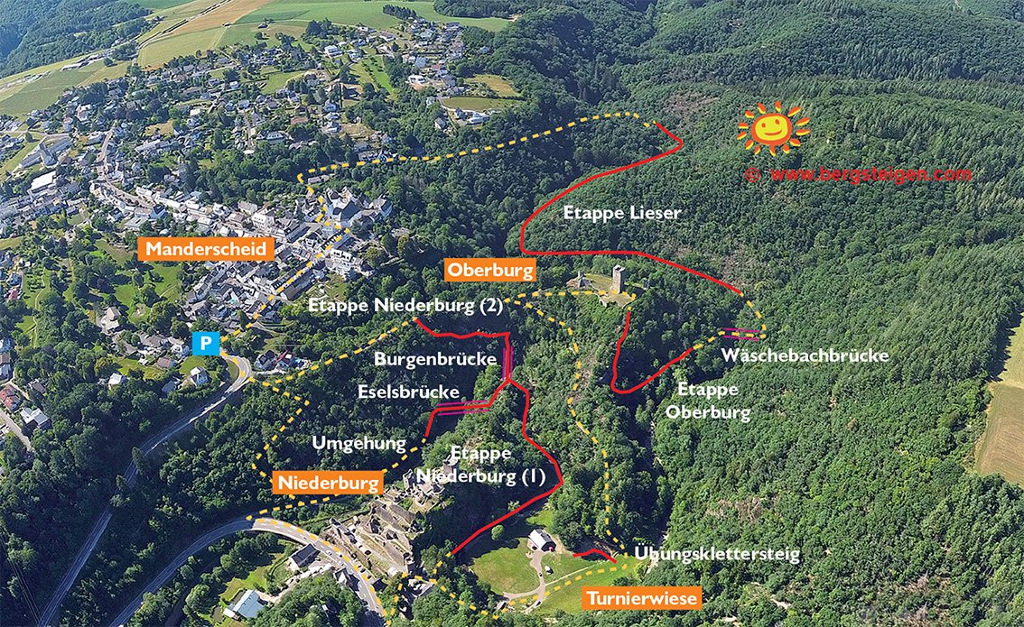 Umgehung Etappe Niederburg Teil 1 (C/D): Von der Turnierwiese über die Brücke und hinauf zur Straße bei der Niederburg. Weiter in Richtung Manderscheid, nach der Brücke auf Forstweg zum Einstieg der Umgehung unterhalb der Eselsbrücke (30 Meter lang). Bei Nutzung der Umgehung muss nur eine kurz C/D Passage nach der Burgenbrücke geklettert werden und man hat sogar zwei lange Seilbrücken in der Route.