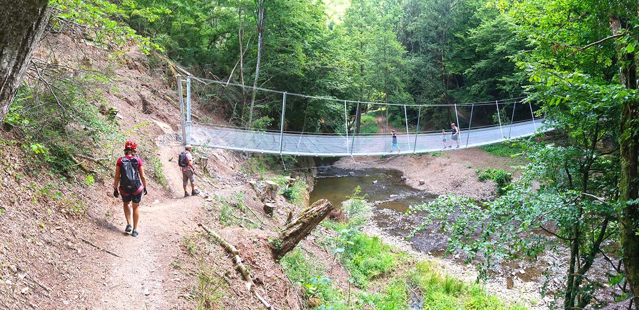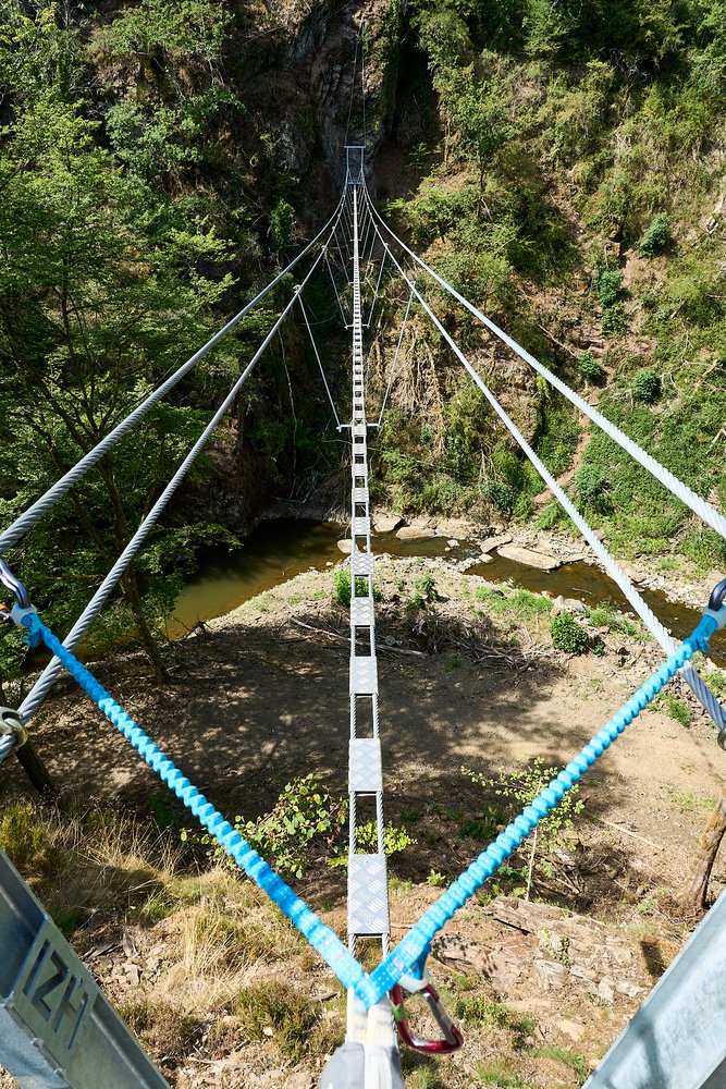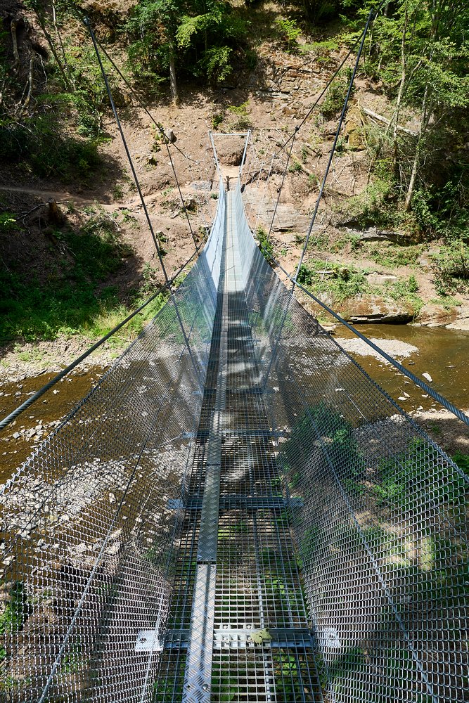 Etappe Niederburg Teil 1 und Teil 2 (D): Fordernder Abschnitt mit einer D-Stelle, in der Mitte als Highlight die 60-Meter-Burgenbrücke. Danach klettert man kurz steil und wieder querend an den Stadtrand von Manderscheid zurück.