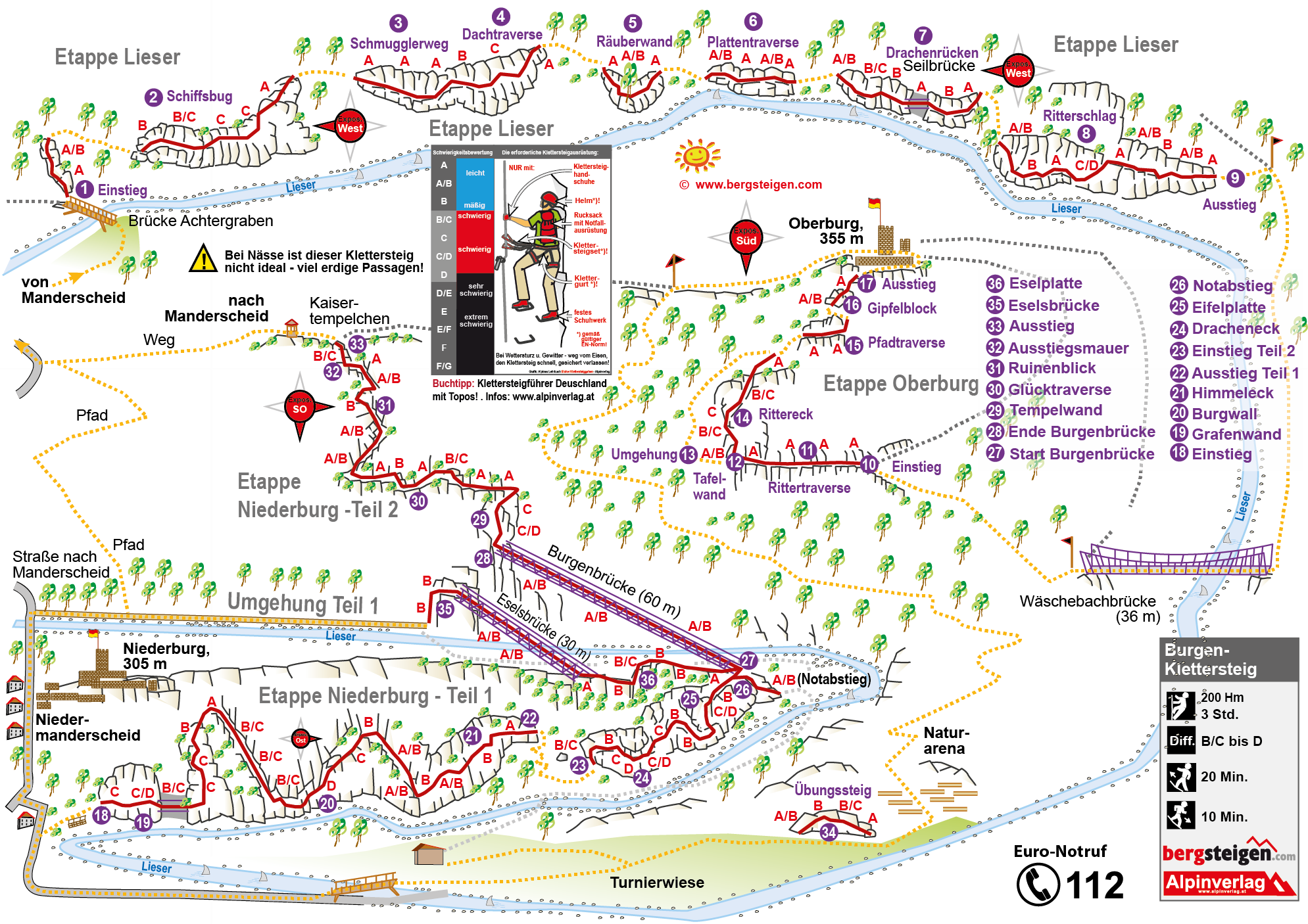 Achtung: Dieser Klettersteig ist recht anspruchsvoll und nicht mit den sehr leichten (Wander-) Routen wie „Collis-Steilpfad“, „Calmont Klettersteig“ oder „Mittelrhein Klettersteig Boppard“ zu vergleichen! Wer unsicher ist, versucht am besten zuerst den „Übungsklettersteig“ (B/C) auf der Turnierwiese, anschließend die kurze „Etappe Oberburg“ (C) (siehe Toposkizze). Tipp: Die Umgehung von Etappe Niederburg Teil 1, reduziert, mit Nutzung der Eselsbrücke, die Schwierigkeit am Ende auf eine kurze Passage C/D; der recht anspruchsvolle Teil 1 der Etappe Niederburg (D) wird umgangen!