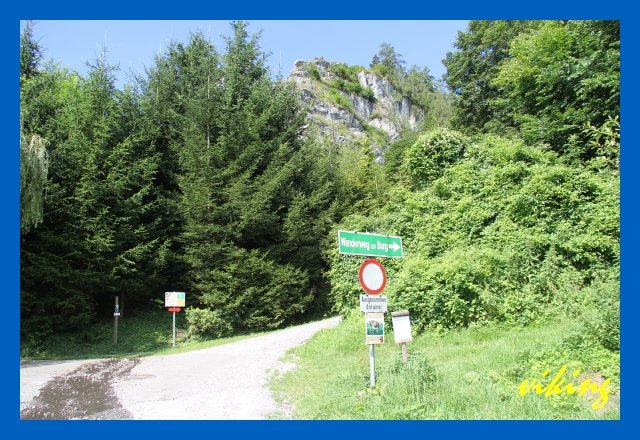 Vom Parkplatz kurz die Straße (nicht rechts dem Wanderweg zur Burg) bis zu den Felsen folgen und rechts zum Einstieg (Tafel).