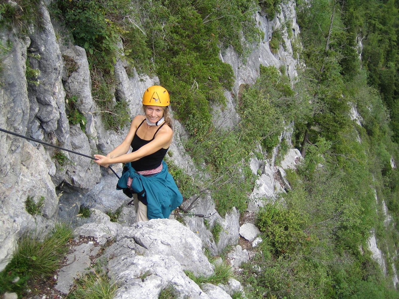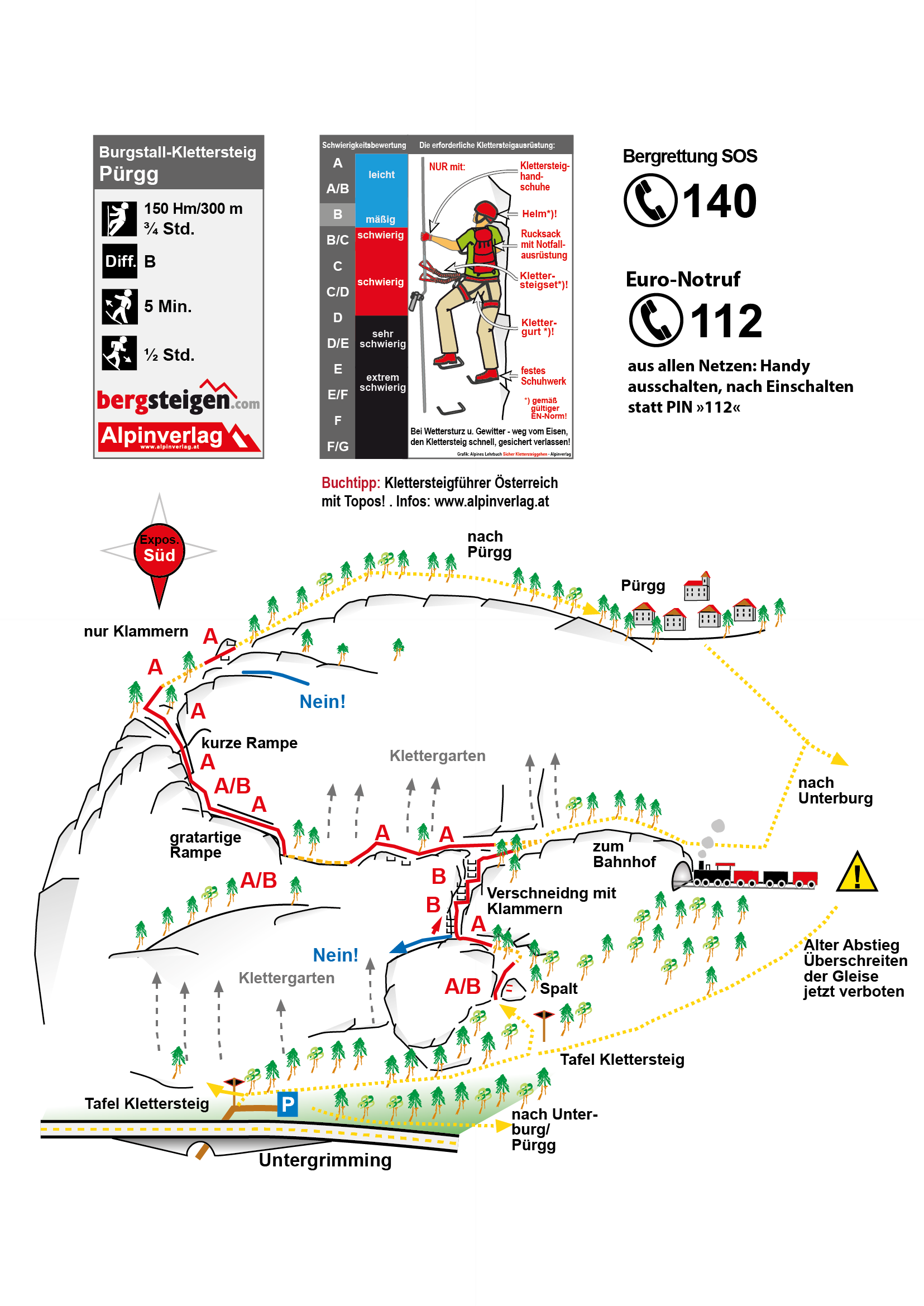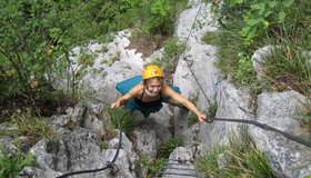 Leichter Klettersteig, der mit B bewertet. Kinder und Anfänger sollten an ein Sicherungsseil genommen werden.