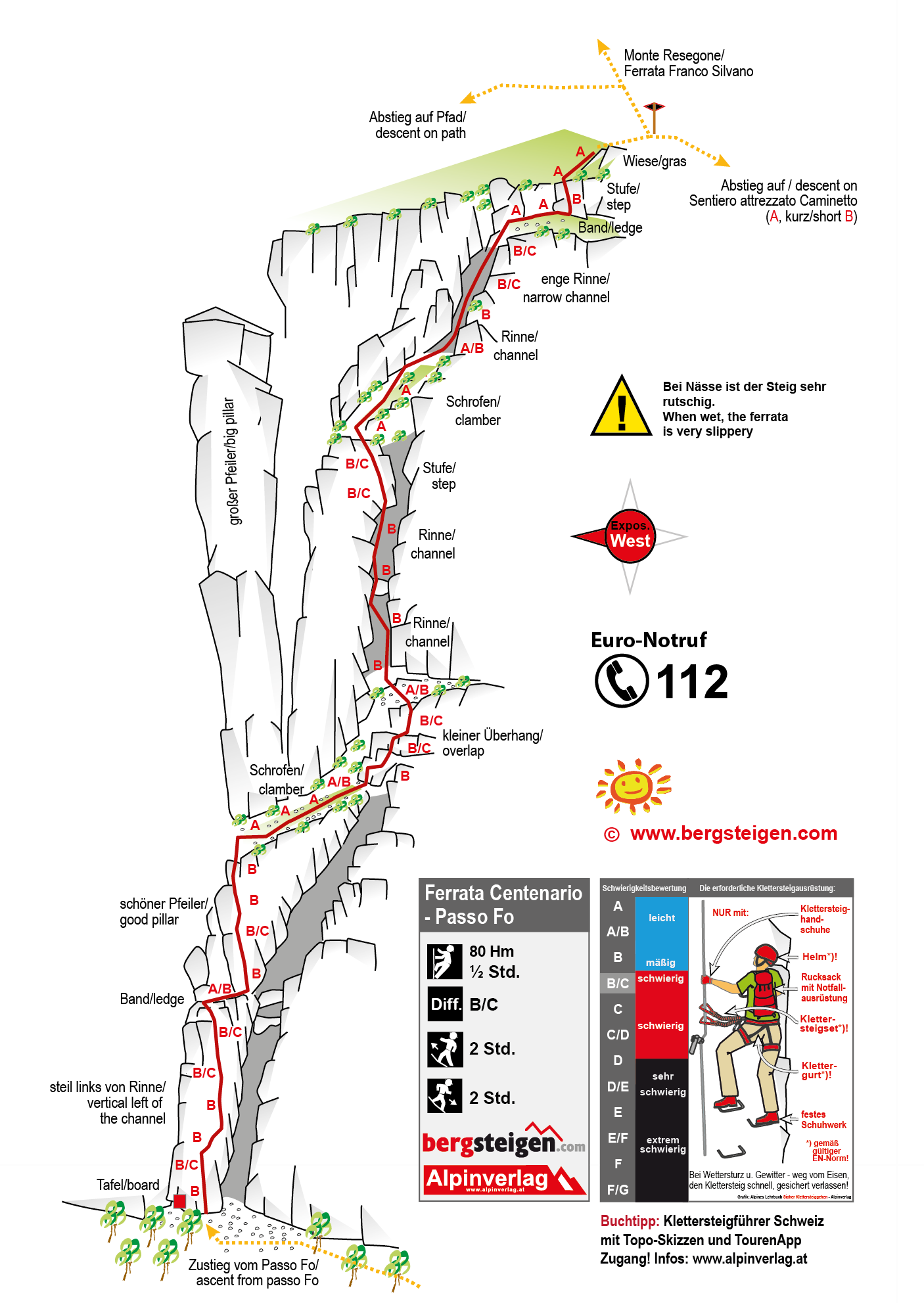 Vom Parkplatz bei der Talstation folgt man dem Weg Nr. 1 bis auf eine Höhe von ca. 1000 m, dann zweigt man rechts in Richtung Passo Fo ab. Vom Passo Fo über die Wiese und links zum Einstieg der Ferrata Centenario.
