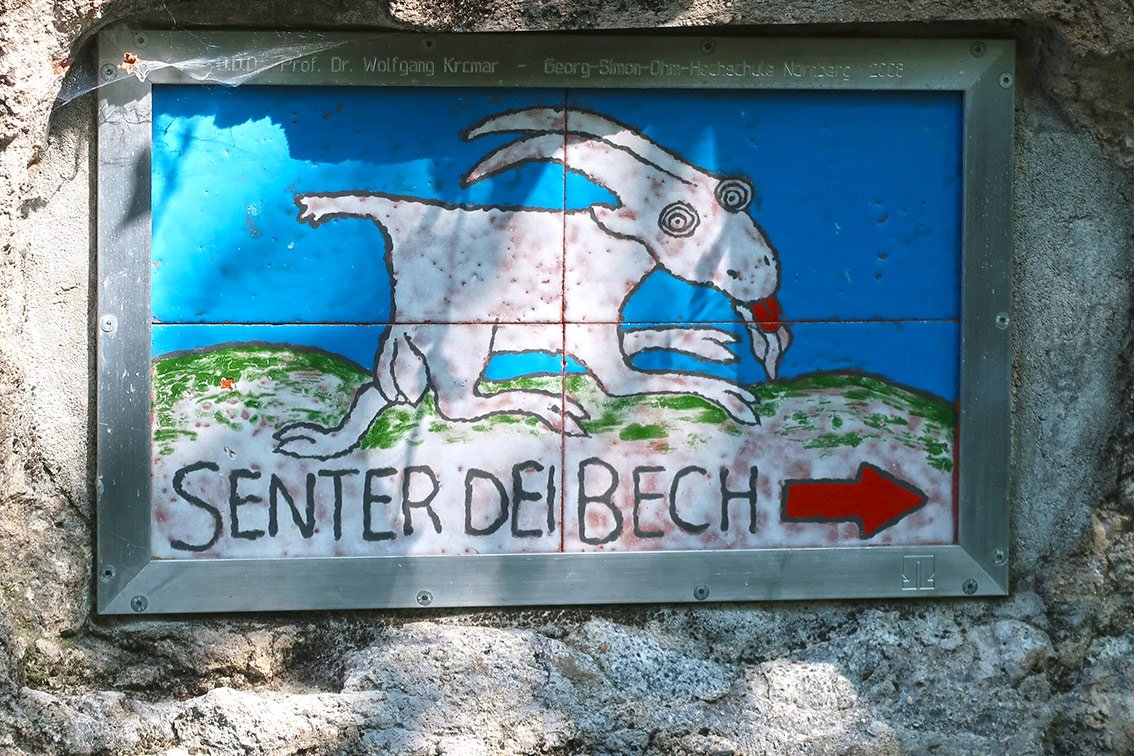 Route - Klettersteigrunde: Via ferrata Susati (B): Bei der Tafel gestuft aufwärts zu den ersten Seilsicherungen (A u. A/B), danach folgt eine schöne Gratpassage (A). Leichtes Gelände (A) führt vor dem Gipfel über eine kurze Seilpassage (A) zur Fahne. Zuerst etwas absteigen, dann auf sehr schmalem Grat (exponierter Grat!) zur Abzweigung (rechts geht es zur Bocca Pasumer). Via ferrata Foletti (B): Durch einen Stellungsgang erreicht man die Sicherungen (A) bei einer Platte, steigt dann auf ein Band (A/B) hinauf und quert wieder eine schöne Platte (A). Zuletzt steiler Abstieg (B) zum Ende des Steiges. Auf dem Weg 460 zur Biwakhütte Arcione mit der Kapelle (von dort Abstieg nach Biacesa möglich, Weg 460). Sent. dei Camminamenti (A/B): Im Zickzack aufwärts zu einem Stollen, dessen Ausstieg eine Leiter (A/B) ist. Weiter gestuft (A/B) und durch einen Stollen (gehen) erreicht man die Abzweigung der Gallerie d. Guerra. Entweder zuerst durch den Tunnel (gehen; Lampe) und dann über den Gipfel (kurze Stellen A/B) zurück oder umgekehrt. Wenn man den Steig nicht mehr absteigen will, kann man vom Nordausgang des Tunnels leicht (Stellen A) zur Boc. Pasumer und noch davor nach Biacesa absteigen. Sent. delle Laste (A/B): Ein leichter Zu- bzw. Abstiegsklettersteig zur Biwakhütte (kurze Stellen A/B), wenn man den unteren Teil des Sent. dei Camminamenti zurückklettert, kann man diesen in die Routen einbauen. Schwächere oder Familien mit Kinder wählen diesen Weg gerne für den Zustieg zur spannenden Gallerie d. Guerra.